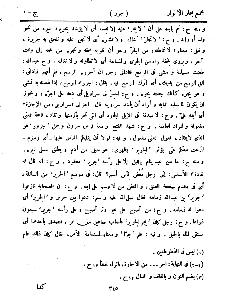 ومنه ح: ثم بايعه على أن "لا يجر" عليه إلا نفسه أي لا يؤخذ بجريرة غيره من نحو ولد أو والد. وح: "لا تجار" أخاك ولا تشاره أي لا تجن عليه وتلحق به جريرة، وقيل: معناه لا تماطله، من الجر وهو أن تلويه بحقه وتجره من محله إلى وقت آخر، ويروى بخفة راء من الجري والمسابقة أي لا تطاوله ولا تغالبه. وح عبد الله: طعنت مسيلمة ومشى في الرمح فناداني رجل أن أجرره الرمح، فلم أفهم فناداني: ألق الرمح من يديك، أي اترك الرمح فيه، يقال: أجررته الرمح، إذا طعنته به فمشى وهو يجره كأنك جعلته يجره. وح: اجسر لي سراويلي أي دعه على أجره، ويجوز أن يكون لما سلبه ثيابه وأراد أن يأخذ سراويله قال: اجز لي سراويلي، من الإجازة أي أبقه علي. وح: لا صدقة في الإبل الجارة أي التي تجر بأزمتها وتقاد، فاعلة بمعنى مفعولة والمراد العاملة. وح: شهد الفتح ومعه فرس حرون وجمل "جرور" هو الذي لا ينقاد، فعول بمعنى مفعول. وفيه: لولا أن يغلبكم الناس عليها- أي زمزم- لنزعت معكم حتى يؤثر "الجرير" بظهري، هو حبل من أدم ويطلق على غيره. ومنه ح: ما من عبد ينام بالليل إلا على رأسه "جرير" معقود. وح: أنه قال له نقادة الأسلمي: إني رجل مغفل فأين اسم؟ قال: في موضع "الجرير" من السالفة، أي في مقدم صفحة العنق، والمغفل من لا وسم على إبله. وح: أن الصحابة نازعوا "جرير" بن عبد الله زمامه فقال صلى الله عليه وسلم: دعوا بين جرير و"الجرير" أي دعوا له زمامه. وح: من أصبح على غير وتر أصبح وعلى رأسه "جرير" سبعون ذراعاً. وح: رجل كان "يجر الجرير" فأصاب صاعين من تمر، فتصدق بأحدهما أي يستقى الماء بالحبل. وفيه: هلم "جرا" ومعناه استدامة الأمر، يقال كان ذلك عام