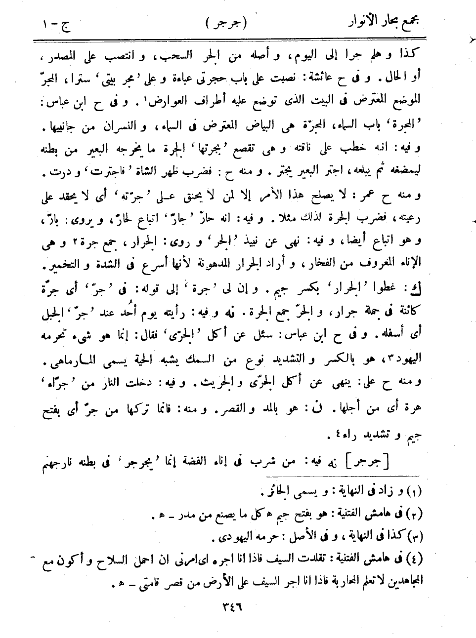 كذا وهلم جرا إلى اليوم، وأصله من الجر السحب، وانتصب على المصدر، أو الحال. وفي ح عائشة: نصبت على باب حجرتي عباءة وعلى "مجر بيتي" ستراً، المجر الموضع المعترض في البيت الذي توضع عليه أطراف العوارض. وفي ح ابن عباس: "المجرة" باب السماء، المجرة هي البياض المعترض في السماء، والنسران من جانبيها. وفيه: أنه خطب على ناقته وهي تقصع "بجرتها" الجرة ما يخرجه البعير من بطنه ليمضغه ثم يبلعه، اجتر البعير يجتر. ومنه ح: فضرب ظهر الشاة "فاجترت" ودرت. ومنه ح عمر: لا يصلح هذا الأمر إلا لمن لا يحنق على "جرته" أي لا يحقد على رعيته، فضرب الجرة لذلك مثلاً. وفيه: أنه حار "جار" أتباع لحار، ويروى: بار، وهو اتباع أيضاً، وفيه: نهى عن نبيذ "الجر" وروى: الجرار، جمع جرة وهي الإناء المعروف من الفخار، وأراد الجرار المدهونة لأنها أسرع في الشدة والتخمير. ك: غطوا "الجرار" بكسر جيم. وإن لي "جرة" إلى قوله: في "جر" أي جرة كائنة في جملة جرار، والجر جمع الجرة. نه وفيه: رأيته يوم أحد عند "جر" الجبل أي أسفله. وفي ح ابن عباس: سئل عن أكل "الجري" فقال: إنما هو شيء تحرمه اليهود، هو بالكسر والتشديد نوع من السمك يشبه الحية يسمى المارماهي. ومنه ح على: ينهى عن أكل الجري والجريث. وفيه: دخلت النار من "جراء" هرة أي من أجلها. ن: هو بالمد والقصر. ومنه: فإنما تركها من جر أي بفتح جيم وتشديد راء.