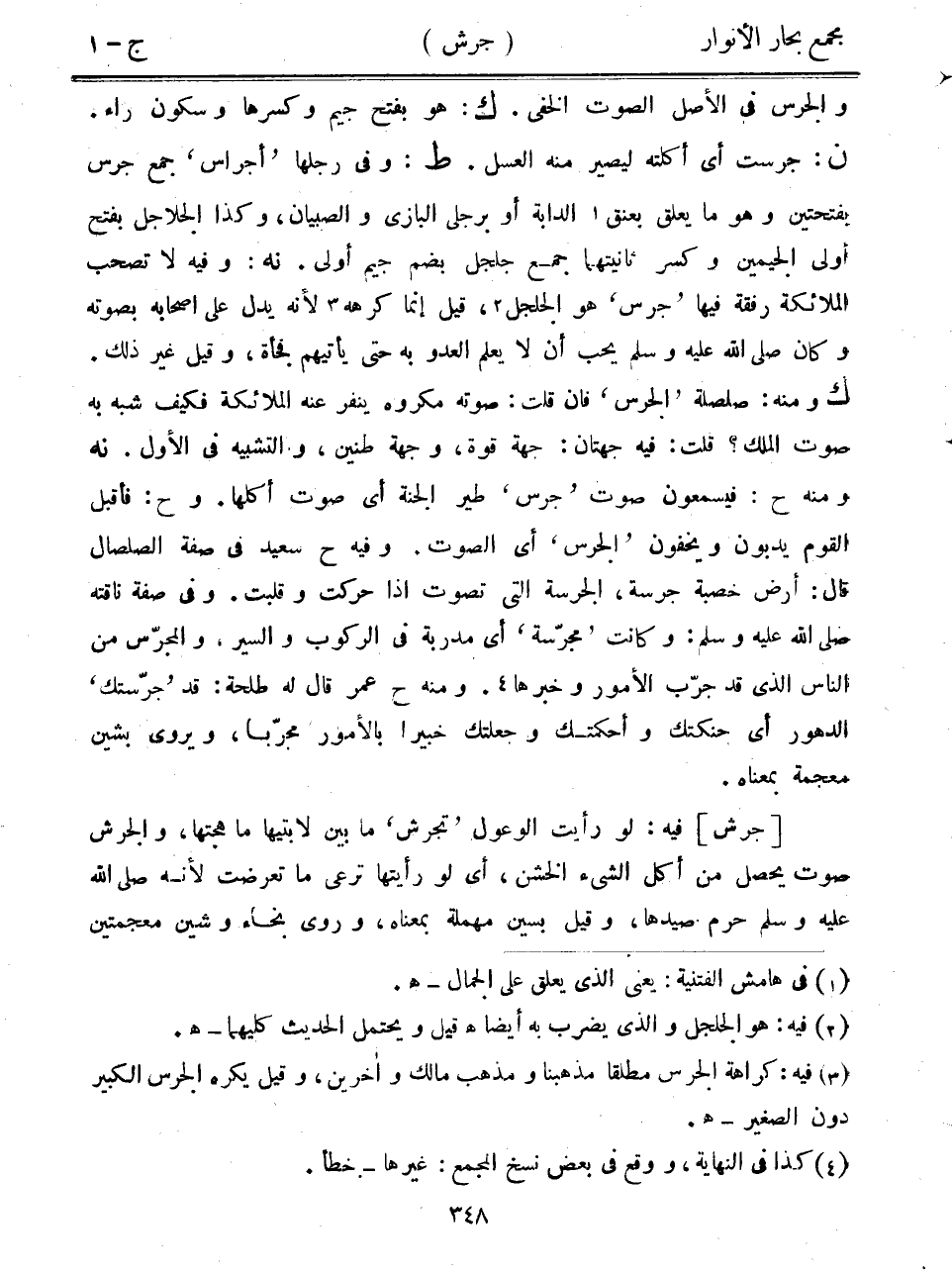 والجرس في الأصل الصوت الخفي. ك: هو بفتح جيم وكسرها وسكون راء. ن: جرست أي أكلته ليصير منه العسل. ط: وفي رجلها "أجراس" جمع جرس بفتحتين وهو ما يعلق بعنق الدابة أو برجلي البازي والصبيان، وكذا الجلاجل بفتح أولى الجيمين وكسر ثانيتهما جمع جلجل بضم جيم أولى. نه: وفيه لا تصحب الملائكة رفقة فيها "جرس" هو الجلجل، قيل إنما كرهه لأنه يدل على أصحابه بصوته وكان صلى الله عليه وسلم يحب أن لا يعلم العدو به حتى يأتيهم فجأة، وقيل غير ذلك. ك ومنه: صلصلة "الجرس" فإن قلت: صوته مكروه ينفر عنه الملائكة فكيف شبه به صوت الملك؟ قلت: فيه جهتان: جهة قوة، وجهة طنين، والتشبيه في الأول. نه ومنه ح: فيسمعون صوت "جرس" طير الجنة أي صوت أكلها. وح: فأقبل القوم يدبون ويخفون "الجرس" أي الصوت. وفيه ح سعيد في صفة الصلصال قال: أرض خصبة جرسة، الجرسة التي تصوت إذا حركت وقلبت. وفي صفة ناقته صلى الله عليه وسلم: وكانت "مجرسة" أي مدربة في الركوب والسير، والمجرس من الناس الذي قد جرب الأمور وخبرها. ومنه ح عمر قال له طلحة: قد "جرستك" الدهور أي حنكتك وأحكمتك وجعلتك خبيراً بالأمور مجرباً، ويروى بشين معجمة بمعناه.