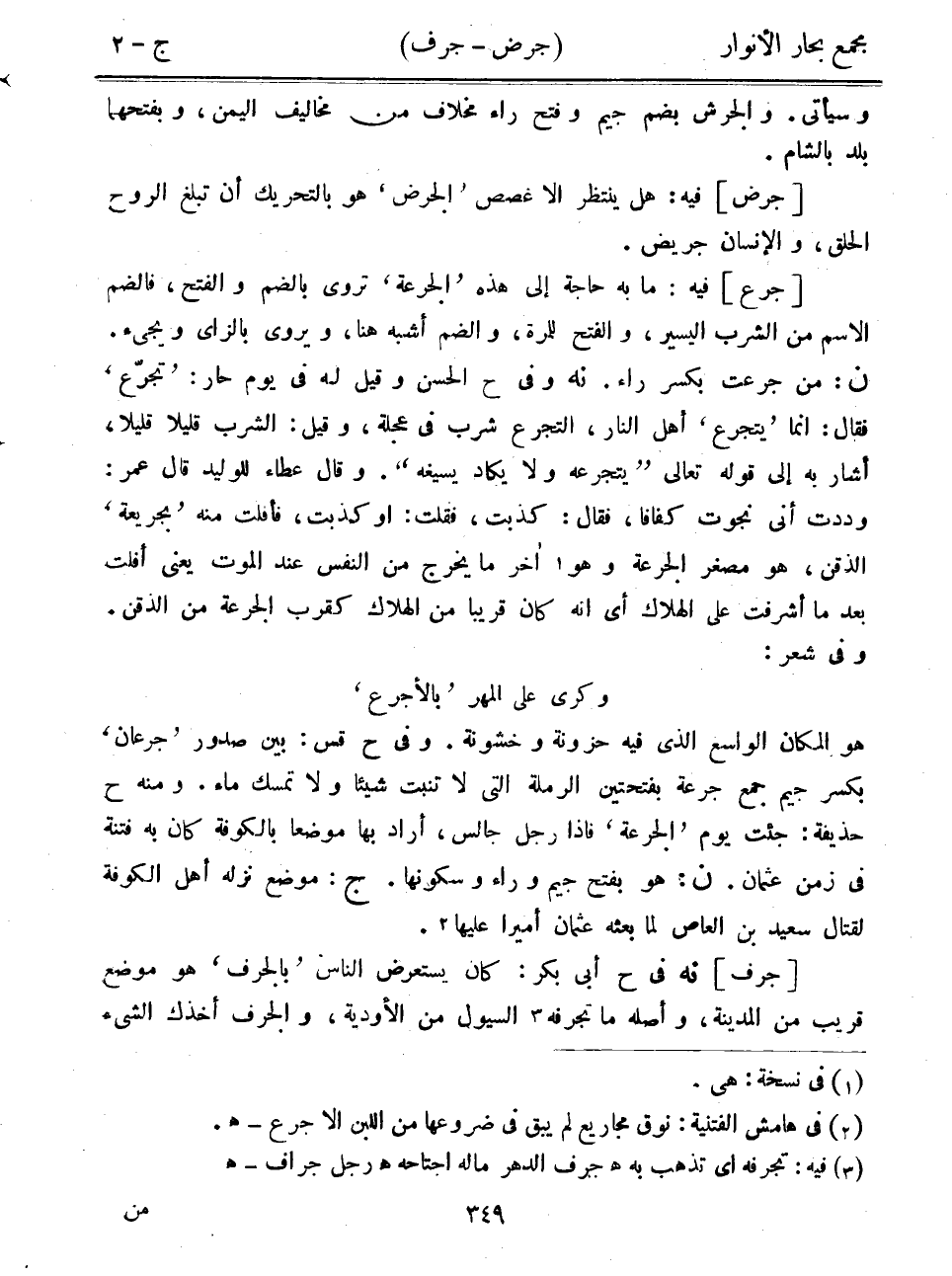 [جرع] فيه: ما به حاجة إلى هذه "الجرعة" تروى بالضم والفتح، فالضم الاسم من الشرب اليسير، والفتح للمرة، والضم أشبه هنا، ويروى بالزاي ويجيء. ن: من جرعت بكسر راء. نه وفي ح الحسن وقيل له في يوم حار: "تجرع" فقال: إنما "يتجرع" أهل النار، التجرع شرب في عجلة، وقيل: الشرب قليلاً قليلاً، أشار به إلى قوله تعالى {يتجرعه ولا يكاد يسيغه}. وقال عطاء للوليد قال عمر: وددت أني نجوت كفافا، فقال: كذبت، فقلت: أو كذبت، فأفلت منه "بجريعة" الذقن، هو مصغر الجرعة وهو آخر ما يخرج من النفس عند الموت يعني أفلت بعد ما أشرفت على الهلاك أي أنه كان قريباً من الهلاك كقرب الجرعة من لاذقن. وفي شعر: