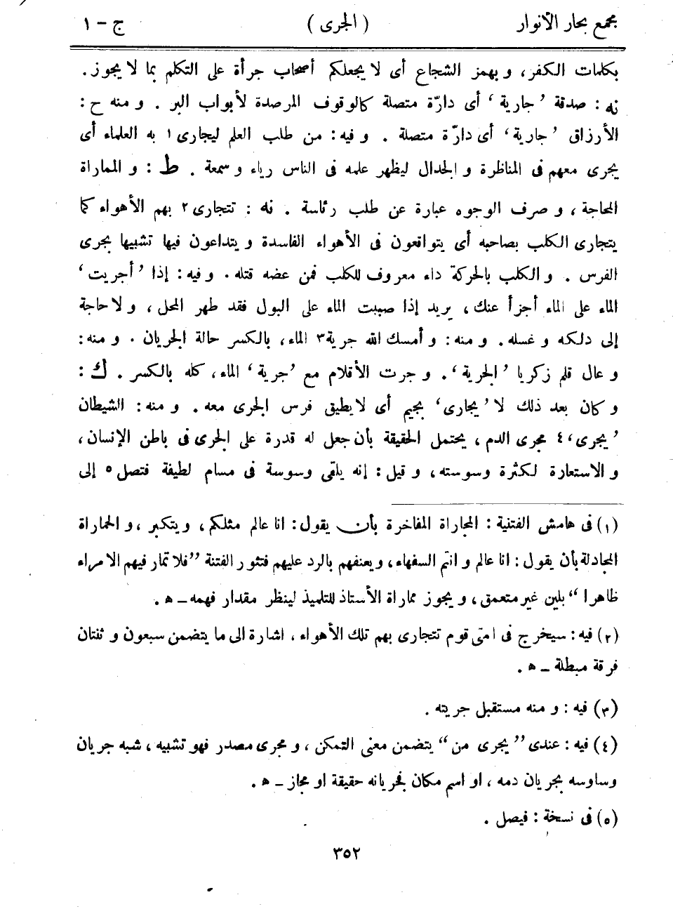 بكلمات الكفر، وبهمز الشجاع أي لا يجعلكم أصحاب جرأة على التكلم بما لا يجوز. نه: صدقة "جارية" أي دارة متصلة كالوقوف المرصدة لأبواب البر. ومنه ح: الأرزاق "جارية" أي دارة متصلة. وفيه: من طلب العلم ليجاري به العلماء أي يجري معهم في المناظرة والجدال ليظهر علمه في الناس رياء وسمعة. ط: والمماراة المحاجة، وصرف الوجوه عبارة عن طلب رئاسة. نه: تتجارة بهم الأهواء كما يتجارة الكلب بصاحبه أي يتواقعون في الأهواء الفاسدة ويتداعون فيها تشبيهاً بجري الفرس. والكلب بالحركة داء معروف للكلب فمن عضه قتله. وفيه: إذا "أجريت" الماء على الماء أجزأ عنك، يريد إذا صببت الماء على البول فقد طهر المحل، ولا حاجة إلى دلكه وغسله. ومنه: وأمسك الله جرية الماء، بالكسر حالة الجريان. ومنه: وعال قلم زكريا "الجرية". وجرت الأقلام مع "جرية" الماء، كله بالكسر. ك: وكان بعد ذلك لا "يجاري" بجيم أي لا يطيق فرس الجري معه. ومنه: الشيطان "يجري" مجرى الدم، يحتمل الحقيقة بأن جعل له قدرة على الجري في باطن الإنسان، والاستعارة لكثرة وسوسته، وقيل: إنه يلقى وسوسة في مسام لطيفة فتصل إلى