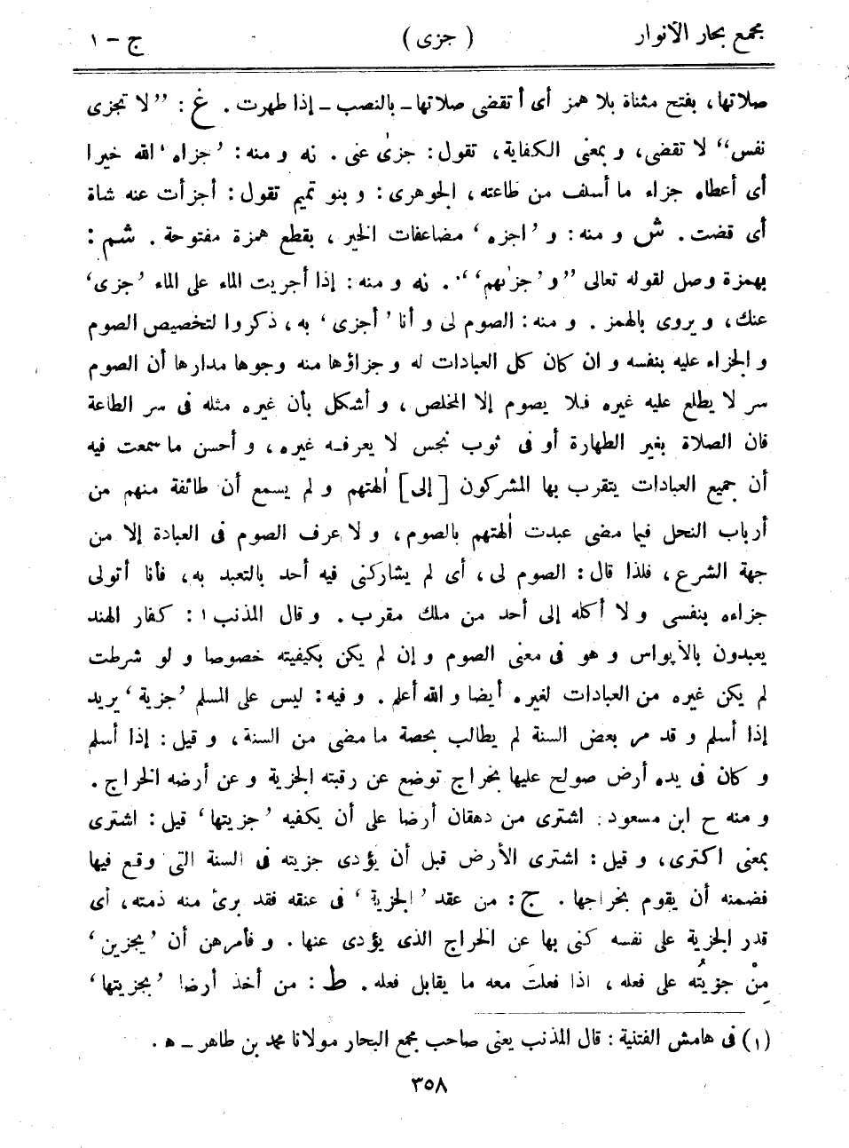 صلاتها، بفتح مثناة بلا همزة أي أتقضي صلاتها- بالنصب- إذا طهرت. غ: "لا تجزى نفس" لا تقضى، وبمعنى الكفاية، تقول: جزى عني. نه ومنه: "جزاه" الله خيراً أي أعطاه جزاء ما أسلف من طاعته، الجوهري: وبنو تميم تقول: أجزأت عنه شاة أي قضت. ش ومنه: و"أجزه" مضاعفات الخير، بقطع همزة مفتوحة. شم: بهمزة وصل لقوله تعالى "و {جزاهم}. نه ومنه: إذا أجريت الماء على الماء "جزى" عنك، ويروى بالهمز. ومنه: الصوم لي وأنا "أجزى" به، ذكروا لتخصيص الصوم والجزاء عليه بنفسه وإن كان كل العبادات له وجزاؤها منه وجوهاً مدارها أن الصوم سر لا يطلع عليه غيره فلا يصوم إلا المخلص، وأشكل بأن غيره مثله في سر الطاعة فإن الصلاة بغير الطهارة أو في ثوب نجس لا يعرفه غيره، وأحسن ما سمعت فيه أن جميع العبادات يتقرب بها المشركون [إلى] آلهتهم ولم يسمع أن طائفة منهم من أرباب النحل فيما مضى عبدت آلهتهم بالصوم، ولا عرف الصوم في العبادة إلا من جهة الشرع، فلذا قال: الصوم لي، أي لم يشاركني فيه أحد بالتعبد به، فأنا أتولى جزاءه بنفسي ولا أكله إلى أحد من ملك مقرب. وقال المذنب: كفار الهند يعبدون بالأ [واس وهو في معنى الصوم وإن لم يكن بكيفيته خصوصاً ولو شرطت لم يكن غيره من العبادات لغيره أيضاً والله أعلم. وفيه: ليس على المسلم "جزية" يريد إذا أسلم وقد مر بعض السنة لم يطالب بحصة ما مضى من السنة، وقيل: إذا أسلم وكان في يده أرض صولح عليها بخراج توضع عن رقبته الجزية وعن أرضه الخراج. ومنه ح ابن مسعود: اشترى من دهقان أرضاً على أن يكفيه "جزيتها" قيل: اشترى بمعنى اكترى، وقيل: اشترى الأرض قبل أن يؤدي جزيته في السنة التي وقع فيها فضمنه أن يقوم بخراجها. ج: من عقد "الجزية" في عنقه فقد برئ منه ذمته، أي قدر الجزية على نفسه كني بها عن الخراج الذي يؤدى عنها. وفأمرهن أن "يجزين" من جزيته على فعله، إذا فعلت معه ما يقابل فعله. ط: من أخذ أرضاً "بجزيتها"