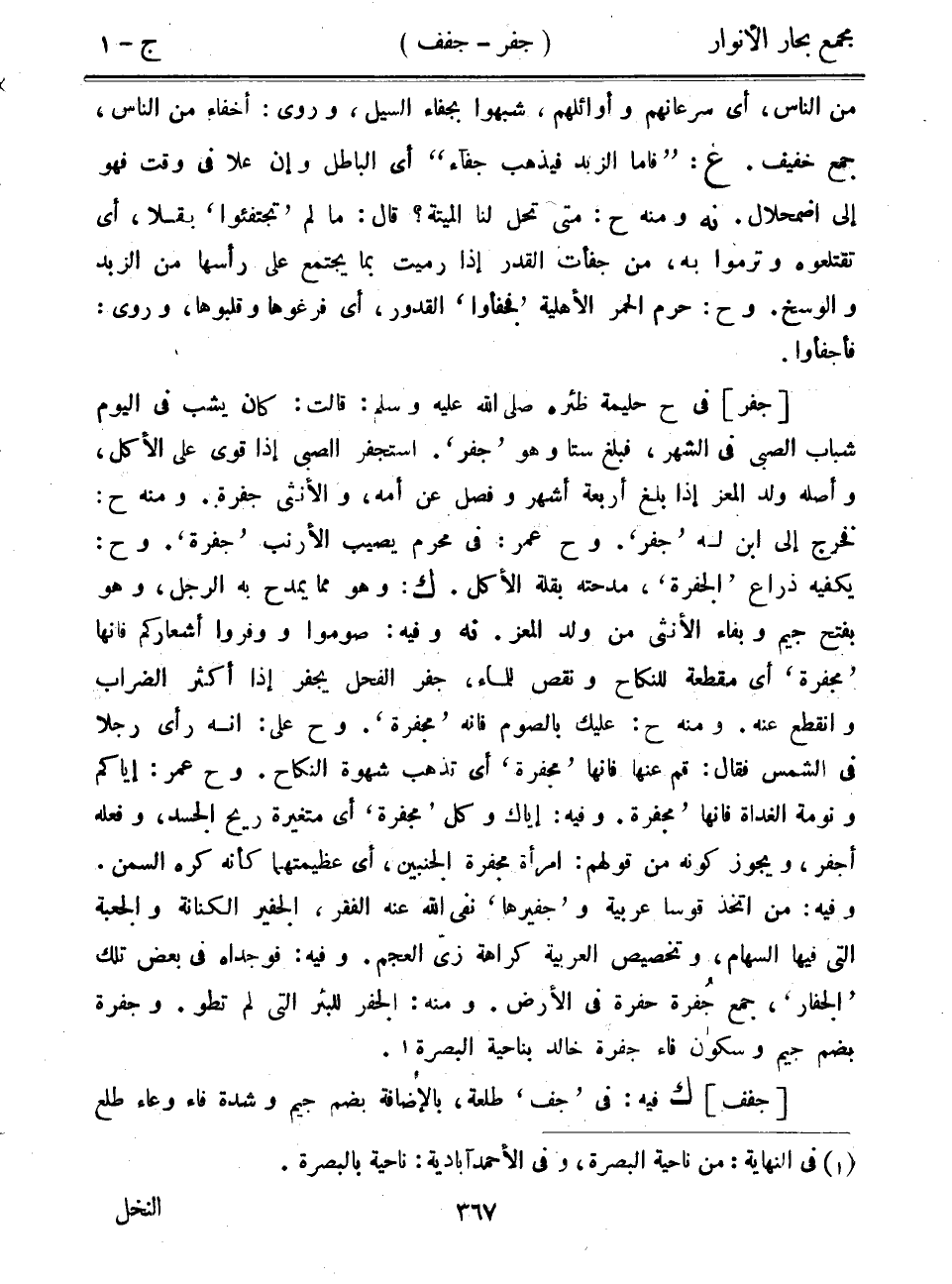 [جفر] في ح حليمة ظئره صلى الله عليه وسلم: قالت: كان يشب في اليوم شباب الصبي في الشهر، فبلغ ستاً وهو "جفر". استجفر الصبي إذا قوي على الأكل، وأصله ولد المعز إذا بلغ أربعة أشهر وفصل عن أمه، والأنثى جفرة. ومنه ح: فخرج إلى ابن له "جفر". وح عمر: في محرم يصيب الأرنب "جفرة". وح: يكفيه ذراع "الجفرة"، مدحته بقلة الأكل. ك: وهو مما يمدح به الرجل، وهو بفتح جيم وبفاء الأنثى من ولد المعز. نه وفيه: صوموا ووفروا أشعاركم فإنها "مجفرة" أي مقطعة للنكاح ونقص للماء، جفر الفحل يجفر إذا أكثر الضراب وانقطع عنه. ومنه ح: عليك بالصوم فإنه "مجفرة". وح على: أنه رأى رجلاً في الشمس فقال: قم عنها فإنها "مجفرة" أي تذهب شهوة النكاح. وح عمر: إياكم ونومة الغداة فإنها "مجفرة". وفيه: إياك وكل "مجفرة" أي متغيرة ريح الجسد، وفعله أجفر، ويجوز كونه من قولهم: امرأة مجفرة الجنبين، أي عظيمتهما كأنه كره السمن. وفيه: من اتخذ قوساً عربية و"جفيرها" نفى الله عنه الفقر، الجفير الكنانة والجعبة التي فيها السهام، وتخصيص العربية كراهة زي العجم. وفيه: فوجداه في بعض تلك "الجفار"، جمع جفرة حفرة في الأرض. ومنه: الجفر للبئر التي لم تطو. وجفرة بضم جيم وسكون فاء جفرة خالد بناحية البصرة.