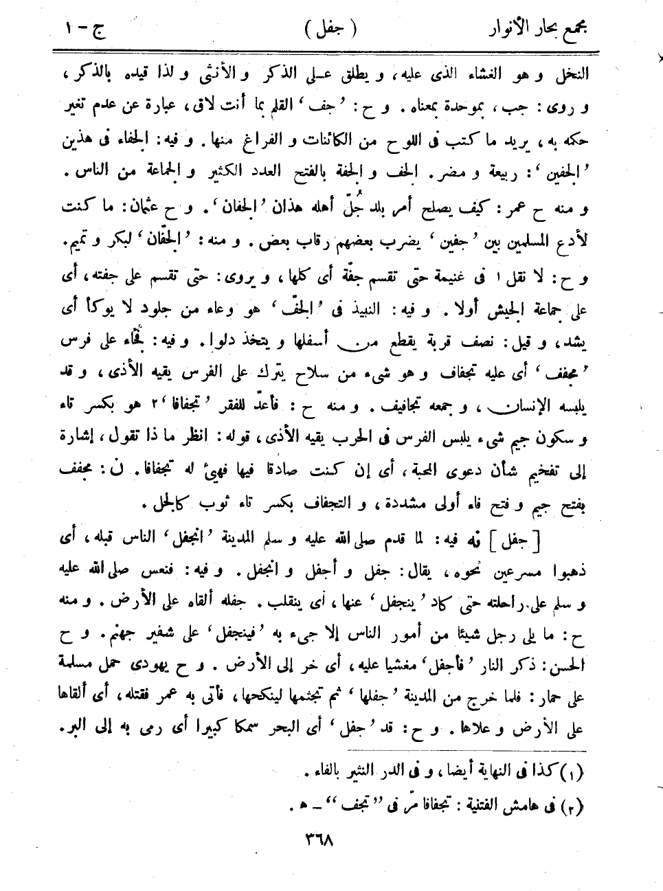 النخل وهو الغشاء الذي عليه، ويطلق على الذكر والأنثى ولذا قيده بالذكر، وروى: جب، بموحدة بمعناه. وح: "جف" القلم بما أنت لاق، عبارة عن عدم تغير حكمه به، يريد ما كتب في اللوح من الكائنات والفراغ منها. وفيه: الجفاء في هذين "الجفين": ربيعة ومضر. الجف والجفة بالفتح العدد الكثير والجماعة من الناس. ومنه ح عمر: كيف يصلح أمر بلد جل أهله هذان "الجفان". وح عثمان: ما كنت لأدع المسلمين بين "جفين" يضرب بعضهم رقاب بعض. ومنه: "الجفان" لبكر وتميم. وح: لا نقل في غنيمة حتى تقسم جفة أي كلها، ويروى: حتى تقسم على جفته، أي على جماعة الجيش أولاً. وفيه: النبيذ في "الجف" هو وعاء من جلود لا يوكأ أي يشد، وقيل: نصف قربة يقطع من أسفلها ويتخذ دلواً. وفيه: فجاء على فرس "مجفف" أي عليه تجفاف وهو شيء من سلاح يترك على الفرس يقيه الأذى، وقد يلبسه الإنسان، وجمعه تجفايف. ومنه ح: فأعد للفقر "تجفافا" هو بكسر تاء وسكون جيم شيء يلبس الفرس في الحرب يقيه الأذى، قوله: انظر ماذا تقول، إشارة إلى تفخيم شأن دعوى المحبة، أي إن كنت صادقاً فيها فهيئ له تجفافاً. ن: مجفف بفتح جيم وفتح فاء أولى مشددة، والتجفاف بكسر تاء ثوب كالجل.