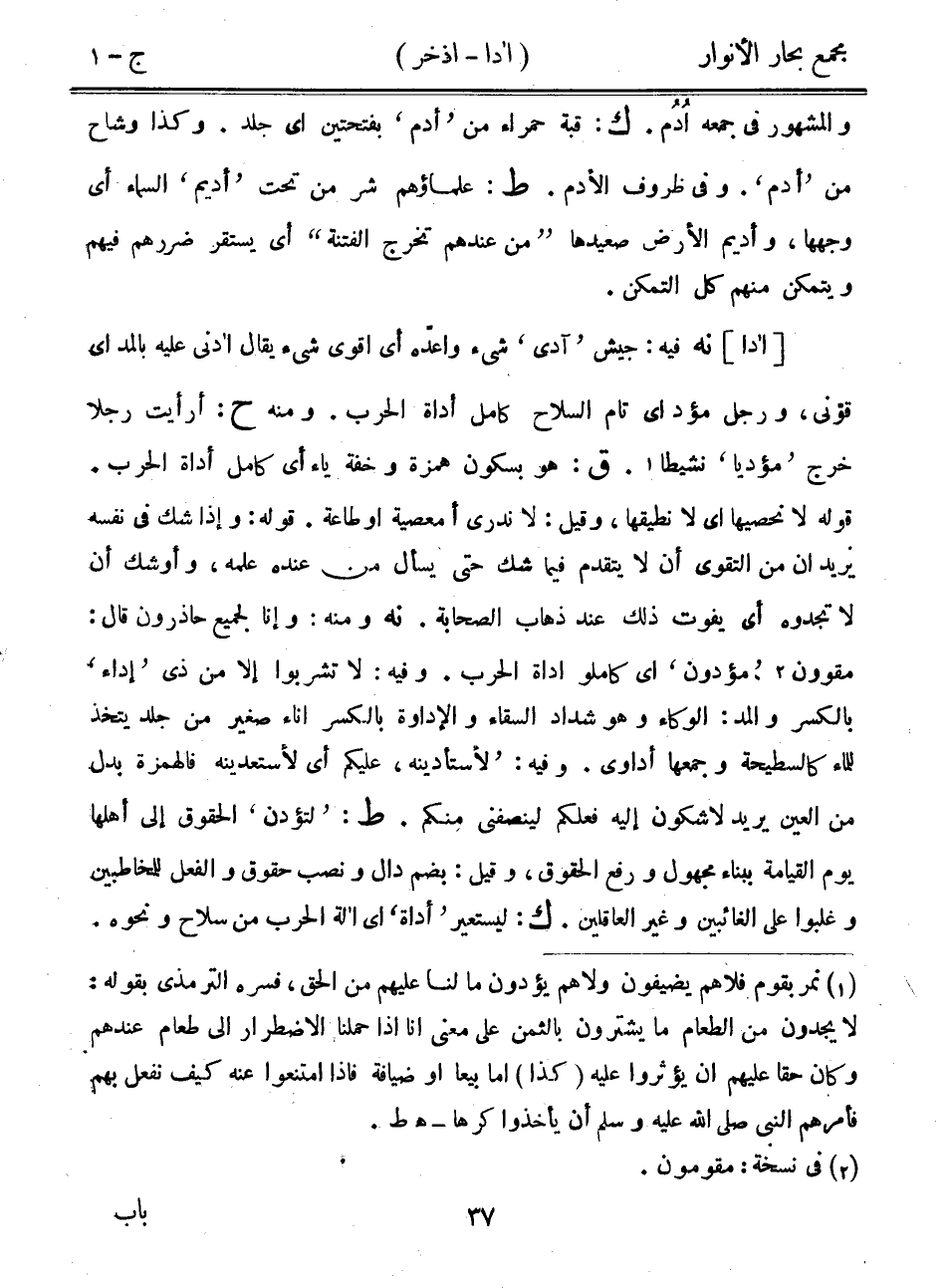 [أدا] نه فيه: جيش "آدى" شيء واعده أي أقوى شيء يقال أدنى عليه بالمد أي قوني، ورجل مؤد أي تام السلاح كامل أداة الحرب. ومنه ح: أرأيت رجلاً خرج "مؤدياً" نشيطا. ق: هو بسكون همزة وخفة ياء أي كامل أداة الحرب. قوله لا نحصيها أي لا نطيقها، وقيل: لا ندري أمعصية أو طاعة. قوله: وإذا شك في نفسه يزيدان من التقوى أن لا يتقدم فيما شك حتى يسأل من عنده علمه، وأوشك أن لا تجدوه أي يفوت ذلك عند ذهاب الصحابة. نه ومنه: وإنا لجميع حاذرون قال: مقوون "مؤدون" أي كاملو أداة الحرب. وفيه: لا تشربوا إلا من ذي "إداء" بالكسر والمد: الوكاء وهو شداد السقاء والإداوة بالكسر إناء صغير من جلد يتخذ للماء كالسطيحة وجمعها أداوى. وفيه: "لأستأدينه" عليكم أي لأستعدينه فالهمزة بدل من العين يريد لا شكون إليه فعلكم لينصفني منكم. ط: "لتؤدن" الحقوق إلى أهلها يوم القيامة ببناء مجهول ورفع الحقوق، وقيل: بضم دال ونصب حقوق والفعل للمخاطبين وغلبوا على الغائبين وغير العاقلين. ك: ليستعير "أداة" أي آلة الحرب من سلاح ونحوه.