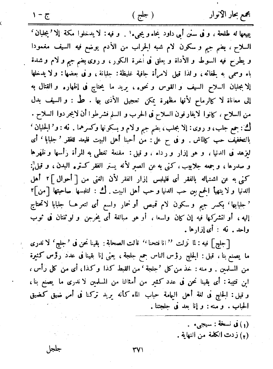 يبيعها له طلحة، وفي سنن أبي داود بحاء ويجيء. وفيه: لا يدخلوا مكة إلا "بجلبان" السلاح، بضم جيم وسكون لام شبه الجراب من الأدم يوضع فيه السيف مغموداً ويطرح فيه السوط والأداة ويعلق في أخرة الكور، وروى بضم جيم ولام وشدة باء وسمي به لجفائه، ولذا قيل لامرأة جافية غليظة: جلبانة، وفي بعضها: ولا يدخلها إلا بجلبان السلاح السيف والقوس ونحوه، يريد ما يحتاج في إظهاره والقتال به إلى معاناة لا كالرماح لأنها مظهرة يمكن تعجيل الأذى بها. ط: والسيف بدل من السلاح، كانوا لا يفارقون السلاح في الحرب والسلم فشرطوا أن لا يجردوا السلاح. ك: جمع جلب، وروى: إلا بجلب، بضم جيم ولام وبسكونها وكسرهما. نه: و"الجلبان" بالتخفيف حب كالماش. وفي ح على: من أحبنا أهل البيت فليعد للفقر "جلباباً" أي ليزهد في الدنيا، وهو إزار ورداء، وقيل: مقنعة تغطي به المرأة رأسها وظهرها وصدرها، وجمعه جلابيب، كني به عن الصبر لأنه يستر الفقر كستره البدن، وقيل: كني به عن اشتماله بالفقر أي فليلبس إزار الفقر لأن الغنى من [أحوال] أهل الدنيا ولا يتهيأ الجمع بين حب الدنيا وحب أهل البيت. ك: لتلبسها صاحبتها [من] "جلبابها" بكسر جيم وسكون لام قميص أو خمار واسع أي لتعرها جلباباً لا تحتاج إليه، أو لتشركها فيه إن كان واسعاً، أو هو مبالغة أي يخرجن ولو ثنتان في ثوب واحد. نه: أي إزارها.
