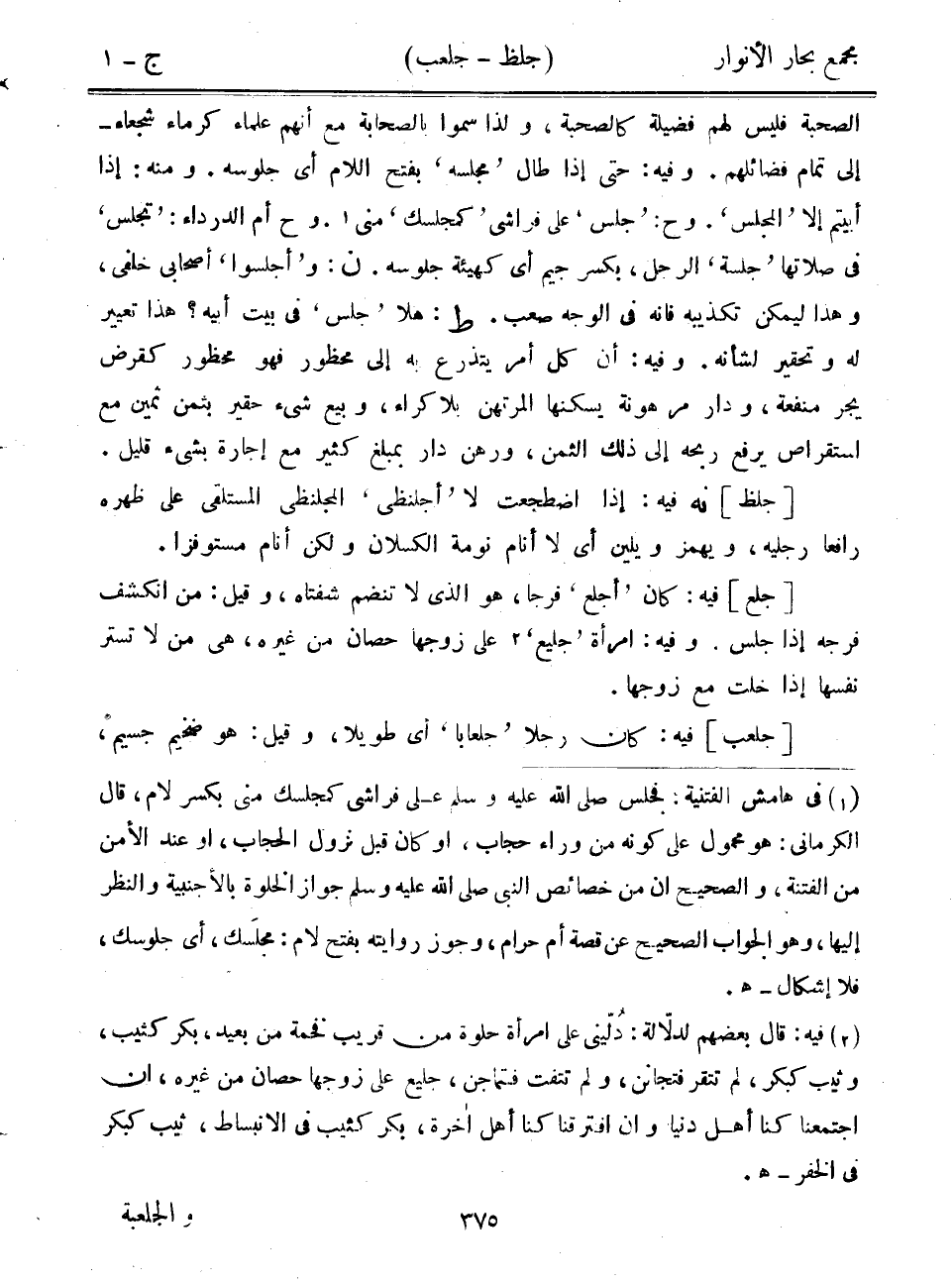 الصحبة فليس لهم فضيلة كالصحبة، ولذا سموا بالصحابة مع أنهم علماء كرماء شجعاء- إلى تمام فضائلهم. وفيه: حتى إذا طال "مجلسه" بفتح اللام أي جلوسه. ومنه: إذا أبيتم إلا "المجلس". وح: "جلس" على فراشي "كمجلسك" مني. وح أم الدرداء: "تجلس" في صلاتها "جلسة" الرجل، بكسر جيم أي كهيئة جلوسه. ن: و"أجلسوا" أصحابي خلفي، وهذا ليمكن تكذيبه فإنه في الوجه صعب. ط: هلا "جلس" في بيت أبيه؟ هذا تعبير له وتحقير لشأنه. وفيه: أن كل أمر يتذرع به إلى محظور فهو محظور كقرض يجر منفعة، ودار مرهونة يسكنها المرتهن بلا كراء، وبيع شيء حقير بثمن ثمين مع استقراص يرفع ربحه إلى ذلك الثمن، ورهن دار بمبلغ كثير مع إجارة بشيء قليل.