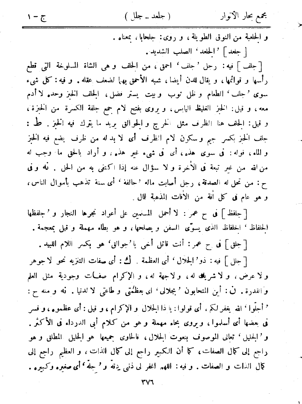 [جلل] فيه: ذو "الجلال" أي العظمة. ك: أي صفات التنزيه نحو لا جوهر ولا عرض، ولا شريك له، ولا جهة له، والإكرام صفات وجودية مثل العلم والقدرة. ن: أين المتحابون "بجلالي" أي بعظمتي وطاعتي لا لدنيا. نه ومنه ح: "أجلوا" الله يغفر لكم، أي قولوا: يا ذا الجلال والإكرام، وقيل: أي عظموه، وفسر في بعضها أي أسلموا، ويروي بحاء مهملة وهو من كلام أبي الدرداء في الأكثر. و"الجليل" تعالى الموصوف بنعوت الجلال، فالحاوي جميعها هو الجليل المطلق وهو راجع إلى كمال الصفات، كما أن الكبير راجع إلى كمال الذات، والعظيم راجع إلى كمال الذات ولاصفات. وفيه: اللهم اغفر لي ذنبي دقه و"جله" أي صغيره وكبيره.