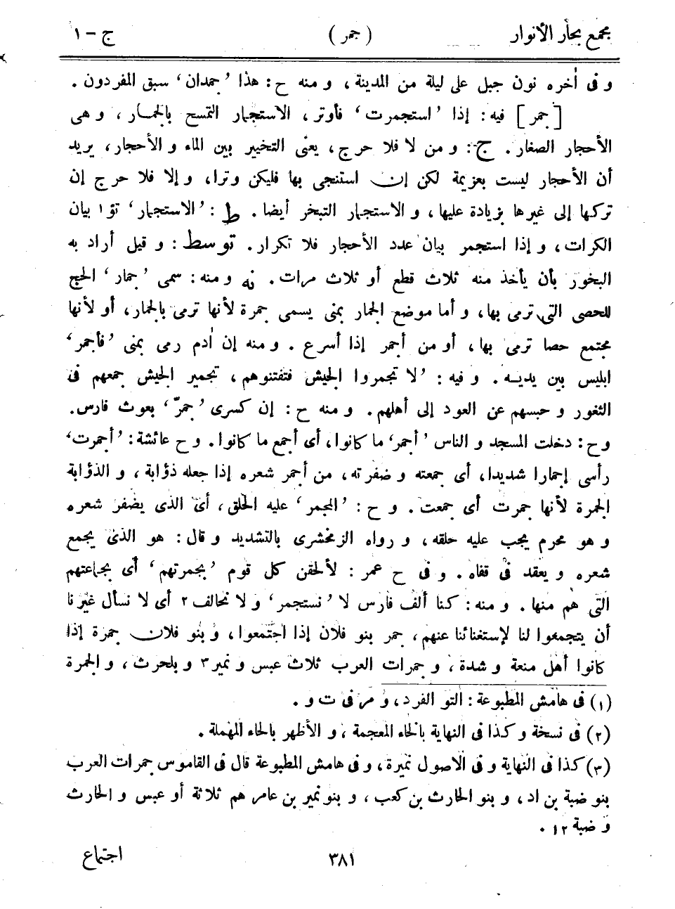 [جمر] فيه: إذا "استجمرت" فأوتر، الاستجمار التمسح بالجمار، وهي الأحجار الصغار. ج: ومن لا فلا حرج، يعني التخيير بين الماء والأحجار، يريد أن الأحجار ليست بعزيمة لكن إن استنجى بها فليكن وتراً، وإلا فلا حرج إن تركها إلى غيرها بزيادة عليها، والاستجمار التبخر أيضاً. ط: "الاستجمار" تو بيان الكرات، وإذا استجمر بيان عدد الأحجار فلا تكرار. توسط: وقيل أراد به البخور بأن يأخذ منه ثلاث قطع أو ثلاثم رات. نه ومنه: سمي "جمار" الحج للحصى التي ترمي بها، وأما موضع الجمار بمنى يسمى جمرة لأنها ترمى بالجمار، أو لأنها مجتمع حصا ترمى بها، أو من أجمر إذا أسرع. ومنه إن أدم رمى بمنى "فأجمر" إبليس بين يديه. وفيه: "لا تجمروا الجيش فتفتنوهم، تجمير الجيش جمعهم في الثغور وحبسهم عن العود إلى أهلهم. ومنه ح: إن كسرى "جمر" بعوث فارس. وح: دخلت المسجد والناس "أجمر" ما كانوا، أي أجمع ما كانوا. وح عائشة: "أجمرت" رأسي إجماراً شديداً، أي جمعته وضفرته، من أجمر شعره إذا جعله ذؤابة، والذؤابة الجمرة لأنها جمرت أي جمعت. وح: "المجمر" عليه الحلق، أي الذي يضفر شعره وهو محرم يجب عليه حلقه، ورواه الزمخشري بالتشديد وقال: هو الذي يجمع شعره ويعقد في قفاه. وفي ح عمر: لألحقن كل قم "بجمرتهم" أي بجماعتهم التي هم منها. ومنه: كنا ألف فارس لا "نستجمر" ولا نحالف أي لا نسأل غيرنا أن يتجمعوا لنا لاستغنائنا عنهم، جمر بنو فلان إذا اجتمعوا، وبنو فلان جمرة إذا كانوا أهل منعة وشدة، وجمرات العرب ثلاث عبس ونمير وبلحرث، والجمرة