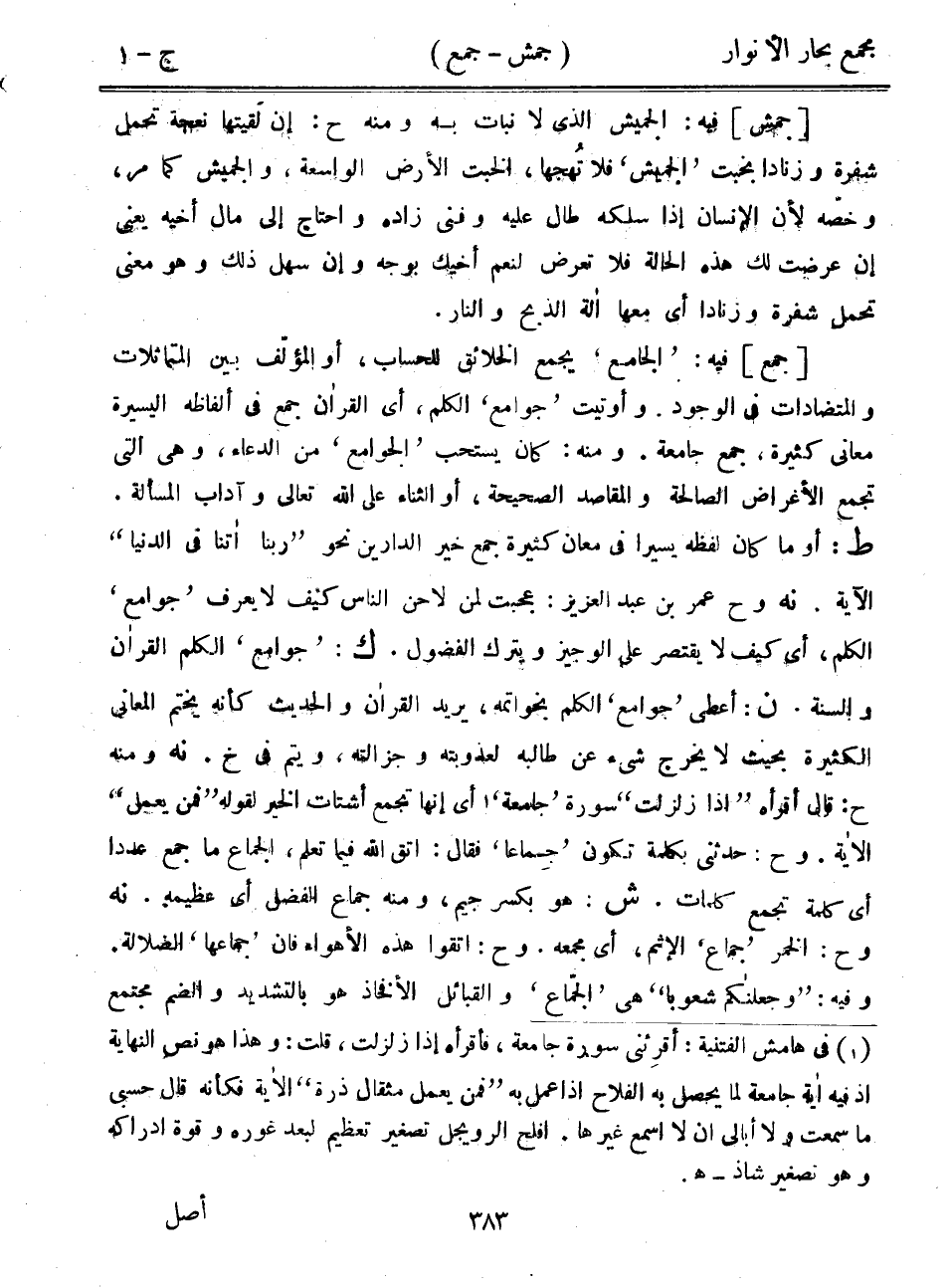 [جمع] فيه: "الجامع" يجمع الخلائق للحساب، أو المؤلف بين المتماثلات والمتضادات في الوجود. وأوتيت "جوامع" الكلم، أي القرآن جمع في ألفاظه اليسيرة معاني كثيرة، جمع جامعة. ومنه: كان يستحب "الجوامع" من الدعاء، وهي التي تجمع الأغراض الصالحة والمقاصد الصحيحة، أو الثناء على الله تعالى وآداب المسألة. ط: أو ما كان لفظه يسيراً في معان كثيرة جمع خير الدارين نحو "ربنا آتنا في الدنيا" الآية. نه وح عمر بن عبد العزيز: عجبت لمن لاحن الناس كيف لا يعرف "جوامع" الكلم، أي كيف لا يقتصر على الوجيز ويترك الفضول. ك: "جوامع" الكلم القرآن والسنة. ن: أعطى "جوامع" الكلم بخواتمه، يريد القرآن والحديث كأنه يختم المعاني الكثيرة بحيث لا يخرج شيء عن طالبه لعذوبته وجزالته، ويتم في خ. نه ومنه ح: قال أقرأه "إذا زلزلت" سورة "جامعة" أي أنها تجمع أشتات الخير لقوله "فمن يعمل" الآية. وح: حدثني بكلمة تكون "جماعاً" فقال: اتق الله فيما تعلم، الجماع ما جمع عدداً أي كلمة تجمع كلمات. ش: هو بكسر جيم، ومنه جماع الفضل أي عظيمه. نه وح: الخمر "جماع" الإثم، أي مجمعه. وح: اتقوا هذه الأهواء فإن "جماعها" الضلالة. وفيه: "وجعلنكم شعوباً" هي "الجماع" والقبائل الأفخاذ هو بالتشديد والضم مجتمع