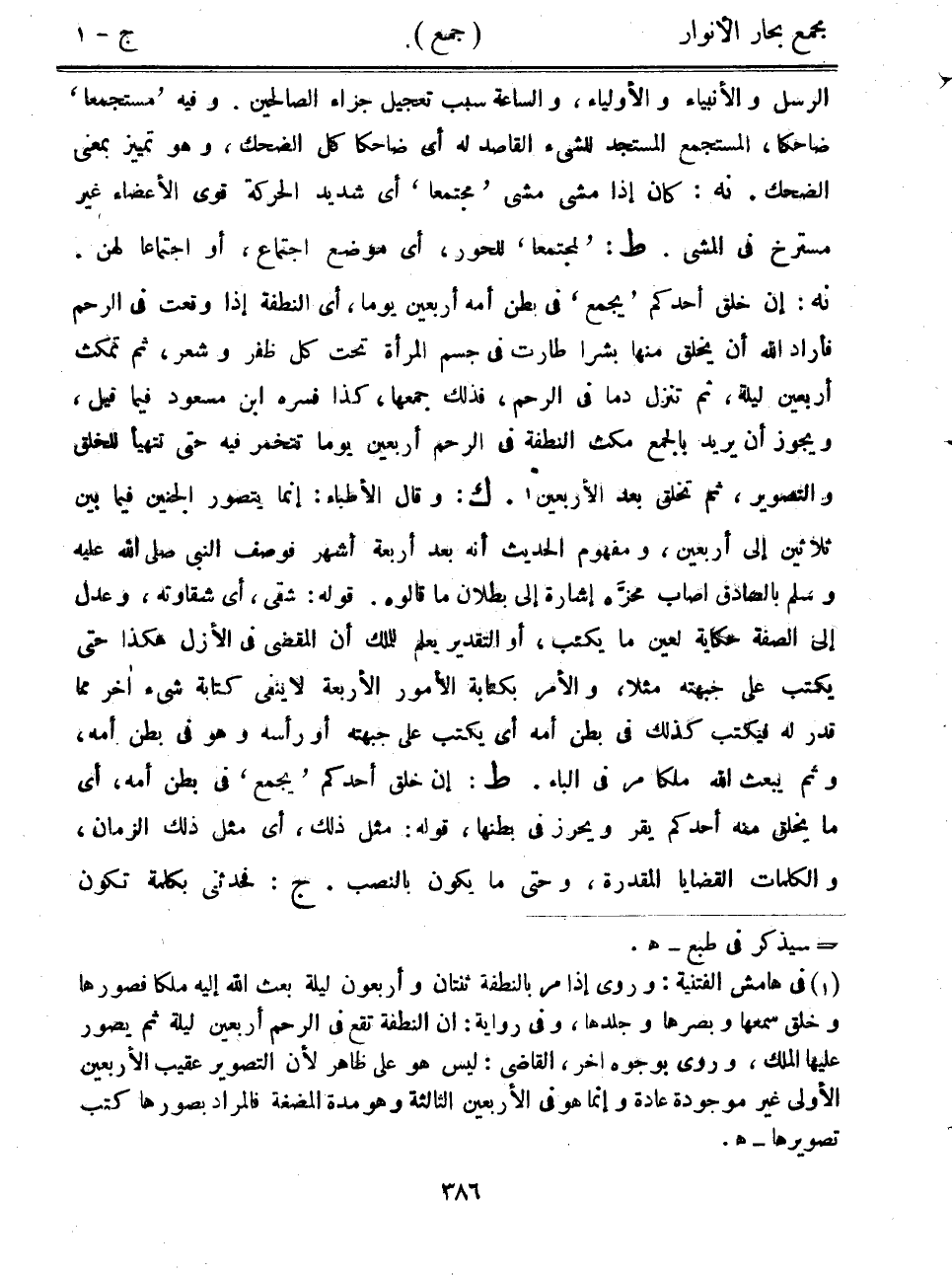 الرسل والأنبياء والأولياء، والساعة سبب تعجيل جزاء الصالحين. وفيه "مستجمعاً" ضاحكاً، المستجمع المستجد للشيء القاصد له أي ضاحكاً كل الضحك، وهو تمييز بمعنى الضحك. نه: كان إذا مشى مشى "مجتمعاً" أي شديد الحركة قوي الأعضاء غير مسترخ في المشي. ط: "لمجتمعا" للحور، أي موضع اجتماع، أو اجتماعاً لهن. نه: إن خلق أحدكم "يجمع" في بطن أمه أربعين يوماً، أي النطفة إذا وقعت في الرحم فأراد الله أن يخلق منها بشراً طارت في جسم المرأة تحت كل ظفر وشعر، ثم تمكث أربعين ليلة، ثم تنزل دماً في الرحم، فذلك جمعها، كذا فسره ابن مسعود فيما قيل، ويجوز أن يريد بالجمع مكث النطفة في الرحم أربعين يوماً تتخمر فيه حتى تتهيأ للخلق والتصوير، ثم تخلق بعد الأربعين. ك: وقال الأطباء: إنما يتصور الجنين فيما بين ثلاثين إلى أربعين، ومفهوم الحديث أنه بعد أربعة أشهر فوصف النبي صلى الله عليه وسلم بالصادق أصاب محزه إشارة إلى بطلان ما قالوه. قوله: شقي، أي شقاوته، وعدل إلى الصفة حكاية لعين ما يكتب، أو التقدير يعلم للملك أن المقضي في الأزل هكذا حتى يكتب على جبهته مثلاً، والأمر بكتابة الأمور الأربعة لاي نفي كتابة شيء آخر مما قدر له فيكتب كذلك في بطن أمه أي يكتب على جبهته أو رأسه وهو في بطن أمه، وثم يبعث الهل ملكاً مر في الباء. ط: إن خلق أحدكم "يجمع" في بطن أمه، أي ما يخلق منه أحدكم يقر ويحرز في بطنها، قوله: مثل ذلك، أي مثل ذلك الزمان، والكلمات القضايا المقدرة، وحتى ما يكون بالنصب. ج: فحدثني بكلمة تكون