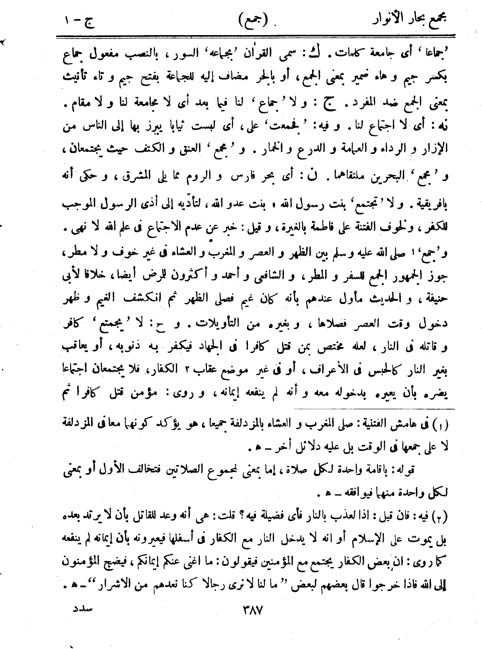 "جماعاً" أي جامعة كلمات. ك: سمى القرآن "بجماعه" السور، بالنصب مفعول جماع بكسر جيم وهاء ضمير بمعنى الجمع، أو بالجر مضاف إليه للجماعة بفتح جيم وتاء تأنيث بمعنى الجمع ضد المفرد. ج: ولا "جماع" لنا فيما بعد أي لا مجامعة لنا ولا مقام. نه: أي لا اجتماع لنا. وفيه: "فجمعت" على، أي لبست ثياباً يبرز بها على الناس من الإزار والرداء والعمامة والدرع والخمار. و "مجمع" العنق والكتف حيث يجتمعان، و"مجمع" البحرين ملتقاهما. ن: أي بحر فارس والروم مما يلي المشرق، وحكى أنه بإفريقية. ولا "تجتمع" بنت رسول الله "بنت عدو الله" لتأديه على أذى الرسول الموجب للكفر، ولخوف الفتنة على فاطمة بالغيرة، وقيل: خبر عن عدم الاجتماع في علم الله لا نهي. و"جمع" صلى الله عليه وسلم بين الظهر والعصر والمغرب والعشاء في غير خوف ولا مطر، جوز الجمهور الجمع للسفر والمطر، والشافعي وأحمد وأكثرون للمرض أيضاً، خلافاً لأبي حنيفة، والحديث مأول عندهم بأنه كان غيم فصلى الظهر ثم انكشف الغيم وظهر دخول وقت العصر فصلاها، وبغيره من التأويلات. وح: لا "يجتمع" كافر وقاتله في النار، لعله مختص بمن قتل كافراً في الجهاد فيكفر به ذنوبه، أو يعاقب بغير النار كالحبس في الأعراف، أو في غير موضع عقاب الكفار، فلا يجتمعان اجتماعاً يضره بأن يعيره بدخوله معه وأنه لم ينفعه إيمانه، وروى: مؤمن قتل كافراً ثم