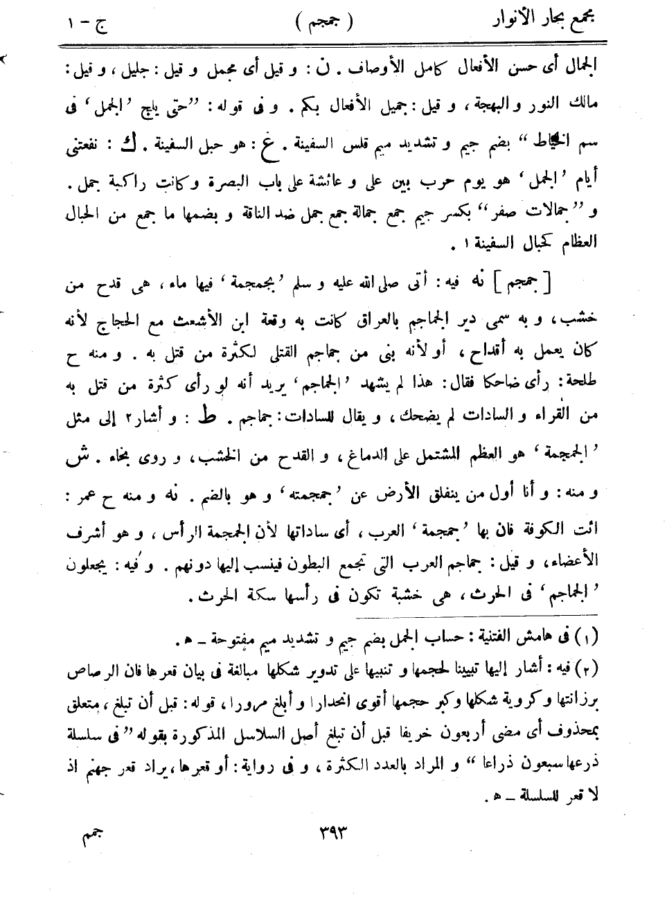 [جمجم] نه فيه: أتى صلى الله عليه وسلم "بجمجمة" فيها ماء، هي قدح من خشب، وبه سمي دير الجماجم بالعراق كانت به وقعة ابن الأشعث مع الحجاج لأنه كان يعمل به أقداح، أو لأنه بني من جماجم القتلى لكثرة من قتل به. ومنه ح طلحة: رأى ضاحكاً فقال: هذا لم يشهد "الجماجم" يريد أنه لو رأى كثرة من قتل به من القراءة والسادات لم يضحك، ويقال للسادات: جماجم. ط: وأشار إلى مثل "الجمجمة" هو العظم المشتمل على الدماغ، والقدح من الخشب، وروى بخاء. ش ومنه: وأنا أول من ينفلق الأرض عن "جمجمته" وهو بالضم. نه ومنه ح عمر: ائت الكوفة فإن بها "جمجمة" العرب، أي ساداتها لأن الجمجمة الرأس، وهو أشرف الأعضاء، وقيل: جماجم العرب التي تجمع البطون فينسب إليها دونهم. وفيه: يجعلون "الجماجم" في الحرث، هي خشبة تكون في رأسها سكة الحرث.