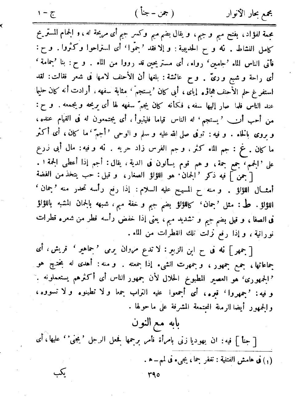 مجمة لفؤاد، بفتح ميم وجيم، ويقال بضم ميم وكسر جيم أي مريحة له، والجمام المستريح كامل النشاط. نه وح الحديبية: وإلا فقد "جموا" أي استراحوا وكثروا. وح: فأتى الناس الماء "جامين" رواء، أي مستريحين قد رووا من الماء. وح: بنا "جمامة" أي راحة وشبع ورى. وح عائشة: بلغها أن الأحنف لامها في شعر فقالت: لقد استفرغ حلم الأحنف هجاؤه إياي، أبي كان "يستجم" مثابة سفهه، أرادت أنه كان حليماً عند الناس فلما صار إليها سفه، فكأنه كان يجم سفهه لها أي يريحه ويجمعه. وح: من أحب أن "يستجم" له الناس قياماً فليتبوأ، أي يجتمعون له في القيام عنده، ويروي بالخاء. وفيه: توفى صلى الله عليه وسلم والوحي "أجم" ما كان، أي أكثر ما كان. غ: جم الماء كثر، وجم الفرس زاد حريه. نه وفيه: مال أبي زرع على "الجمم" جمع جمة، وهم قوم يسألون في الدية، يقال: أجم إذا أعطى الجمة.