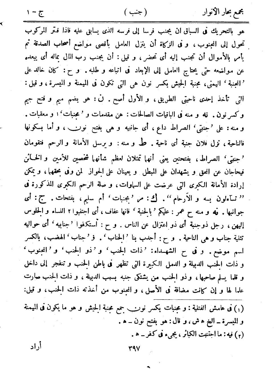 هو بالتحريك في السباق أن يجنب فرساً إلى فرسه الذي يسابق عليه فإذا فتر المركوب تحول إلى المجنوب، وفي الزكاة أن ينزل العامل بأقصى مواضع أصحاب الصدقة ثم يأمر بالأموال أن تجنب إليه أي تحضر، وقيل: أني جنب رب المال بماله أي يبعده عن مواضعه حتى يحتاج العامل إلى الإبعاد في إتباعه وطلبه. وح: كان خالد علي "المجنبة" اليمنى، مجنبة الجيش بكسر نون هي التي تكون في الميمنة والميسرة، وقيل: التي تأخذ إحدى ناحيتي الطريق، والأول أصح. ن: هو بضم ميم وفتح جيم وكسر نون. نه ومنه في الباقيات الصالحات: هن مقدمات و"مجنبات" ومعقبات. ومنه: على "جنبتي" الصراط داع، أي جانبيه وهي بفتح نون، وأما بسكونها فالناحية، نزل فلان جنبة أي ناحية. ط ومنه: ويرسل الأمانة والرحم فتقومان "جنبتي" الصراط، بفتحتين يعني أنهما تمثلات لعظم شأنهما شخصين للأمين والخائن فيحاجان عن المحق ويشهدان على المبطل ويعينان على الجواز لمن وفى بحقهما، ويمكن إرادة الأمانة الكبرى التي عرضت على السماوات، وصلة الرحم الكبرى المذكورة في "تساءلون به والأرحام". ك: مر "بجنبات" أم سليم، بفتحات. ج: أي جوانبها. نه ومنه ح عمر: عليكم "بالجنبة" فإنها عفاف، أي اجتنبوا النساء والجلوس إليهن، رجل ذو جنبة أي ذو اعتزال عن الناس. وح: استكفوا "جنابيه" أي حواليه تثنية جناب وهي الناحية. وح: أجدب بنا "الجناب". و"جناب" الهضب، بالكسر اسم موضع. وفي ح الشهداء: "ذات الجنب" و"ذو الجنب" و"المجنوب" وذات الجنب الدبيلة والدمل الكبيرة التي تظهر في باطن الجنب وتنفجر إلى داخل وقلما يسلم صاحبها، وذو الجنب من يشتكي جنبه بسبب الدبيلة، وذات الجنب صارت علماً لها وإن كانت مضافة في الأصل، والمجنوب من أخذته ذات الجنب، وقيل:
