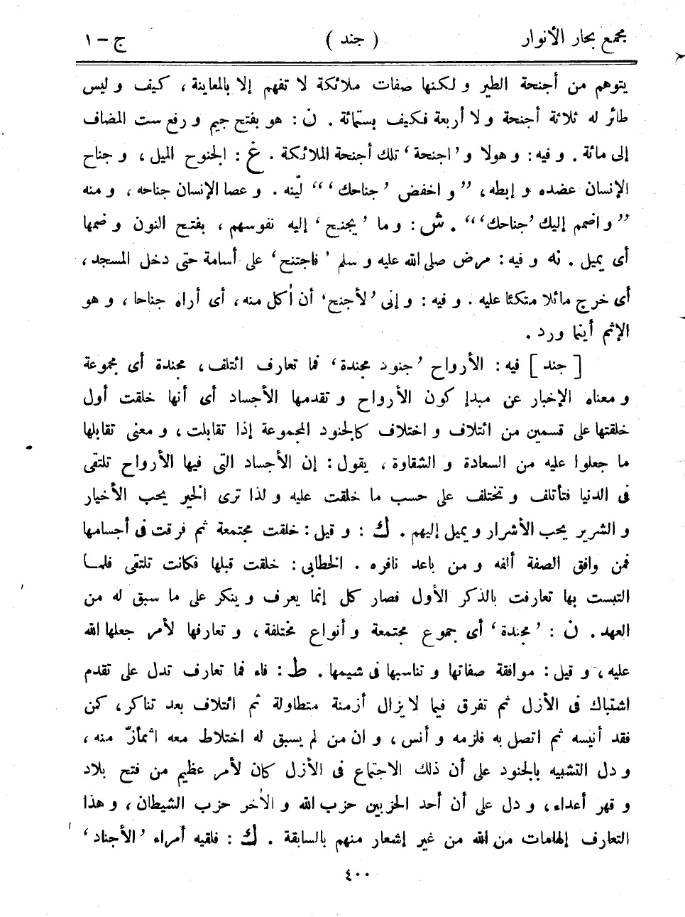 يتوهم من أجنحة الطير ولكنها صفات ملائكة لا تفهم إلا بالمعاينة، كيف وليس طائر له ثلاثة أجنحة ولا أربعة فكيف بستمائة. ن: هو بفتح جيم ورفع ست المضاف إلى مائة. وفيه: وهولا و"أجنحة" تلك أجنحة الملائكة. غ: الجنوح الميل، وجناح الإنسان عضده وإبطه، "واخفض "جناحك"" لينه. وعصا الإنسان جناحه، ومنه "واضمم إليك "جناحك"". ش: وما "يجنح" إليه نفوسهم، بفتح النون وضمها أي يميل. نه وفيه: مرض صلى الله عليه وسلم "فاجتنح" على أسامة حتى دخل المسجد، أي خرج مائلاً متكئاً عليه. وفيه: وإني "لأجنح" أن أكل منه، أي أراه جناحاً، وهو الإثم أينما ورد.