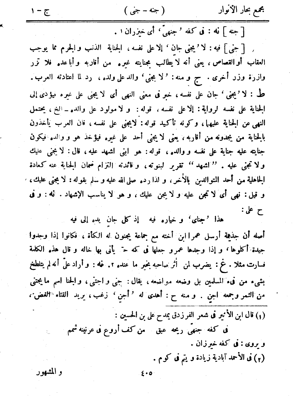 [جنى] فيه: لا "يجني جان" إلا على نفسه، الجناية الذنب والجرم مما يوجب العقاب أو القصاص، يعني أنه لا يطالب بجنايته غيره من أقاربه وأباعده فلا تزر وازرة وزر أخرى. ج ومنه: "لا يجني" والد على ولده، رد لما اعتادته العرب. ط: لا "يجني" جان على نفسه، خبر في معنى النهي لا يجني على غيره فيؤدي إلى الجناية على نفسه لرواية: إلا على نفسه، قوله: ولا مولود على والده- إلخ، يحتمل النهي عن الجناية عليهما، وكونه تأكيد قوله: لا يجني على نفسه، فإن العرب يأخذون بالجناية من يجدونه من أقاربه، يعني لا يجني أحد على غيره فيؤخذ هو ووالده فيكون جنايته على جناية على نفسه ووالده، قوله: هو ابني أشهد عليه، قال: لا يجني عليك ولا تجنى عليه. "اشهد" تقرير لبنوته، وفائدته التزام ضمان الجناية عنه كعادة الجاهلية من أحد المتوالدين بالآخر، ولذا رده صلى الله عليه وسلم بقوله: لا يجني عليك، وقيل: نهى أي لا تجن عليه ولا يجن عليك، وهو لا يناسب الإشهاد. نه: وفي ح على: