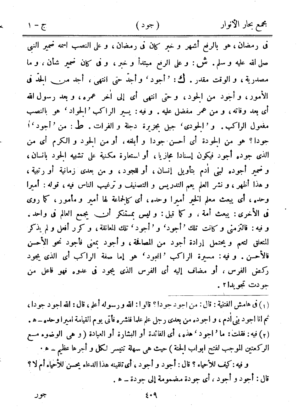 في رمضان، هو بالرفع أشهر وخبر كان في رمضان، وعلى النصب اسمه ضمير النبي صلى الله عليه وسلم. ش: وعلى الرفع مبتدأ وخبر، وفي كان ضمير شأن، وما مصدرية، والوقت مقدر. ك: "أجود" وأجد حتى انتهى، أجد من الجد في الأمور، وأجود من الجود، وحتى انتهى أي إلى آخر عمره، وبعد رسول الله أي بعد وفاته، ومن عمر مفضل عليه. وفيه: يسير الراكب "الجواد" هو بالنصب مفعول الراكب. و"الجودي" جبل بجزيرة دجلة والفرات. ط: من "أجود" جوداً؟ هو من الجودة أي أحسن جوداً وأبلغه، أو من الجود والكرم أي من الذي جوده أجود فيكون إسناداً مجازياً، أو استعارة مكنية على تشبيه الجود بإنسان، وضمير أجوده لبني آدم بتأويل إنسان، أو للجود، ومن بعدي زمانية أو رتبية، وهذا أظهر، ونشر العلم يعم التدريس والتصنيف وترغيب الناس فيه، قوله: أميراً وحده، أي يبعث معلم الخير أميراً وحده، أي كالجماعة لها أمير ومأمور، كما روى في الأخرى: يبعث أمة، وكما قيل: وليس بمستنكر أن يجمع العالم في واحد. وفيه: فالتزمني وكانت تلك "أجود" و"أجود" تلك المعانقة، وكرر أفعل ولم يذكر المتعلق لتعم ويحتمل إرادة أجودة من المصافحة، وأجود بمعنى فأجود نحو الأحسن فالأحسن. وفيه: مسيرة الراكب "المجود" هو إما صفة الراكب أي الذي يجود ركض الفرس، أو مضاف إليه أي الفرس الذي يجود في عدوه فهو فاعل من جودت تجويداً.