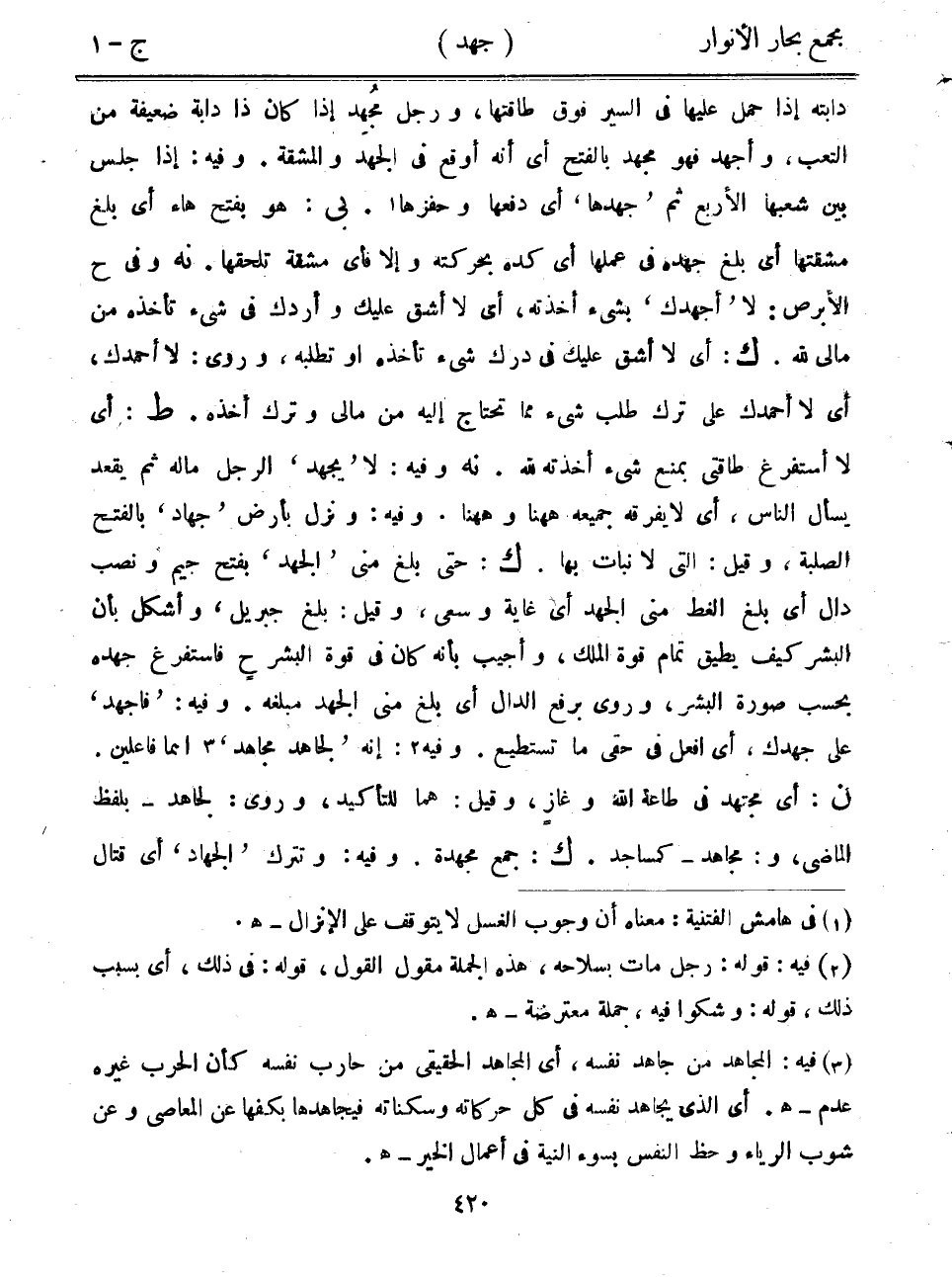 دابته إذا حمل عليها في السير فوق طاقتها، ورجل مجهد إذا كان ذا دابة ضعيفة من التعب، وأجهد فهو مجهد بالفتح أي أنه أوقع في الجهد والمشقة. وفيه: إذا جلس بين شعبها الأربع ثم "جهدها" أي دفعها وحفزها. بي: هو بفتح هاء أي بلغ مشقتها أي بلغ جهده في عملها أي كده بحركته وإلا فأي مشقة تلحقها. نه وفي ح الأبرص: لا "أجهدك" بشيء أخذته، أي لا أشق عليك وأردك في شيء تأخذه من مالي لله. ك: أي لا أشق عليك في درك شيء تأخذه أو تطلبه، وروى: لا أحمدك، أي لا أحمدك على ترك طلب شيء مما تحتاج إليه من مالي وترك أخذه. ط: أي لا أستفرغ طاقتي بمنع شيء أخذته لله. نه وفيه: لا "يجهد" الرجل ماله ثم يقعد يسأل الناس، أي لا يفرقه جميعه ههنا وههنا. وفيه: ونزل بأرض "جهاد" بالفتح الصلبة، وقيل: التي لا نبات بها. ك: حتى بلغ مني "الجهد" بفتح جيم ونصب دال أي بلغ الغط مني الجهد أي غاية وسعي، وقيل: بلغ جبريل، وأشكل بأن البشر كيف يطيق تمام قوة الملك، وأجيب بأنه كان في قوة البشر ح فاستفرغ جهده بحسب صورة البشر، وروى برفع الدال أي بلغ مني الجهد مبلغه. وفيه: "فاجهد" على جهدك، أي افعل في حقي ما تستطيع. وفيه: إنه "لجاهد مجاهد" إنما فاعلين. ن: أي مجتهد في طاعة الله وغاز، وقيل: هما للتأكيد، وروى: لجاهد- بلفظ الماضي، و: مجاهد- كمساجد. ك: جمع مجهدة. وفيه: وتترك "الجهاد" أي قتال