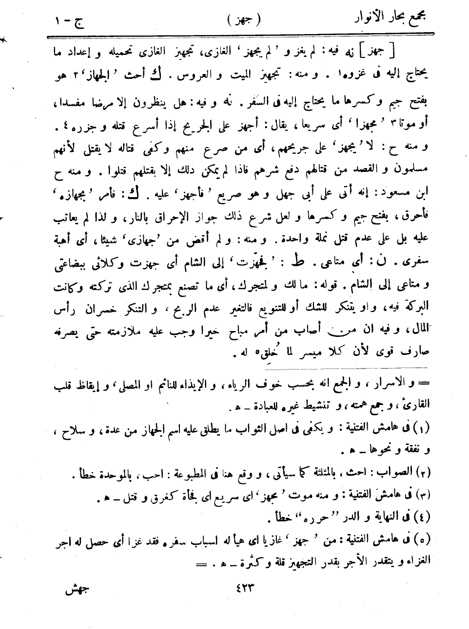 [جهز] نه فيه: لم يغزو "لم يجهز" الغازي، تجهيز الغازي تحميله وإعداد ما يحتاج إليه في غزوه. ومنه: تجهيز الميت والعروس. ك أحث "الجهاز" هو بفتح جيم وكسرها ما يحتاج إليه في السفر. نه وفيه: هل ينظرون إلا مرضاً مفسداً، أو موتاً "مجهزاً" أي سريعاً، يقال: أجهز على الجريح إذا أسرع قتله وجزره. ومنه ح: لا "يجهز" على جريحهم، أي من صرع منهم وكفى قتاله لا يقتل لأنهم مسلمون والقصد من قتالهم دفع شرهم فإذا لم يمكن ذلك إلا بقتلهم قتلوا. ومنه ح ابن مسعود: إنه أتى على أبي جهل وهو صريع "فأجهز" عليه. ك: فأمر "بجهازه" فأحرق، بفتح جيم وكسرها ولعل شرع ذلك جواز الإحراق بالنار، ولذا لم يعاتب عليه بل على عدم قتل نملة واحدة. ومنه: ولم أقض من "جهازي" شيئاً، أي أهبة سفري. ن: أي متاعي. ط: "فجهزت" إلى الشام أي جهزت وكلائي ببضاعتي ومتاعي إلى الشام. قوله: ما لك ولمتجرك، أي ما تصنع بمتجرك الذي تركته وكانت البركة فيه، واو يتنكر للشك أو للتنويع فالتغير عدم الربح، والتنكر خسران رأس المال، وفيه أن من أصاب من أمر مباح خيراً وجب عليه ملازمته حتى يصرفه صارف قوي لأن كلاً ميسر لما خلق له.