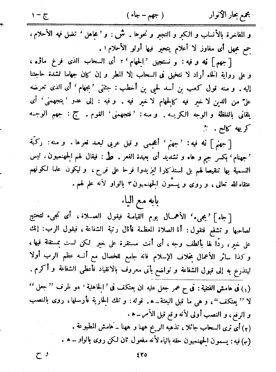 [جهنم] نه فيه: "جهنم" أعجمي وقيل عربي لبعد قعرها. ومنه: ركية "جهنام" بكسر جيم وهاء وتشديد أي بعيدة القعر. ط: فيقال لهم الجهنميون، ليس التسمية بها تنقيصاً لهم بل استذكاراً ليزيدوا فرحاً على فرح، وليكون علماً لكونهم عتقاء الله تعالى، وروى ويسمون الجهنميون بالواو لأنه علم لهم.