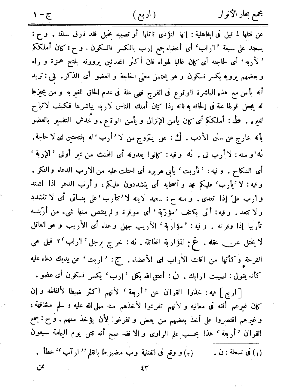 عن قتلها لما قيل في الجاهلية: إنها لتؤذي قاتلها أو تصيبه بخبل فقد فارق سنتنا. وح: يسجد على سبعة "أراب" أي أعضاء جمع إرب بالكسر فالسكون. وح: كان أملككم "لأربه" أي لحاجته أي كان غالباً لهواه فإن أكثر المحدثين يروونه بفتح همزة وراء وبعضهم يرويه بكسر فسكون وهو يحتمل معنى الحاجة والعضو أي الذكر. بي: تريد أنه يأمن مع هذه المباشرة الوقوع في الفرج فهي علة في عدم إلحاق الغير به ومن يجيزها له يجعل قولها علة في إلحاقه به فإنه إذا كان أملك الناس لإربه يباشرها فكيف لا تباح لغيره. ط: أملككم أي كان يأمن الإنزال ويأمن الوقاع، وخدش التفسير بالعضو بأنه خارج عن سنن الأدب. ك: هل يتزوج من لا "أرب" له بفتحتين أي لا حاجة. نه ومنه: لا أرب لي. نه وفيه: كانوا يعدونه أي المخنث من غير أولى "الإربة" أي النكاح. وفيه: "فأربت" بأبي هريرة أي احتلت عليه من الإرب الدهاء والنكر. وفيه: لا "يأرب" عليكم محمد وأصحابه أي يتشددون عليكم، وأرب الدهر إذا اشتد وأرب علي إذا تعدى. ومنه ح: سعيد لابنه لا "تتأرب" على بناتي أي لا تتشدد ولا تتعد. وفيه: أتى بكتف "مؤربة" أي موفرة ولم ينقص منها شيء من أربته تأريباً إذا وفرته. وفيه: "مؤاربة" الأريب جهل وعناء أي الأريب وهو العاقل لا يختل عن عقله. غ: المؤاربة المخاتلة. نه: خرج برجل "أراب" قيل هي القرحة وكأنها من أفات الأراب أي الأعضاء. ج: "أربت" عن يديك دعاء عليه كأنه يقول: أصيبت أرابك. ن: أعتق الله بكل "إرب" بكسر فسكون أي عضو.