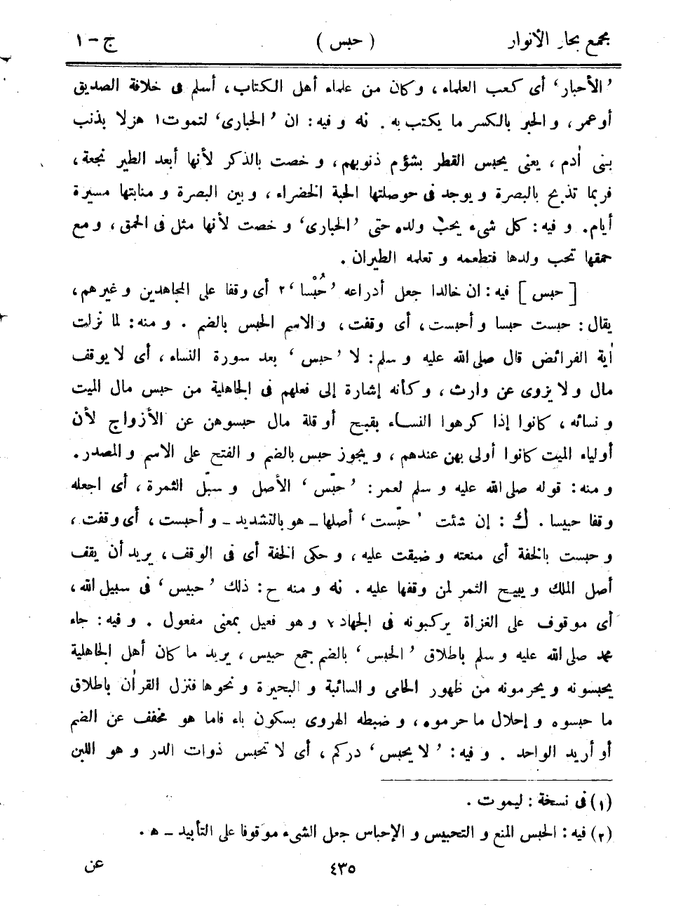 "الأحبار" أي كعب العلماء، وكان من علماء أهل الكتاب، أسلم في خلافة الصديق أو عمر، والحبر بالكسر ما يكتب به. نه وفيه: أن "الحبارى" لتموت هزلاً بذنب بني آدم، يعني يحبس القطر بشؤم ذنوبهم، وخصت بالذكر لأنها أبعد الطير نجعة، فربما تذبح بالبصرة ويوجد في حوصلتها الحبة الخضراء، وبين البصرة منابتها مسيرة أيام. وفيه: كل شيء يحب ولده حتى "الحبارى" وخصت لأنها مثل في الحمق، ومع حمقها تحب ولدها فتطعمه وتعلمه الطيران.