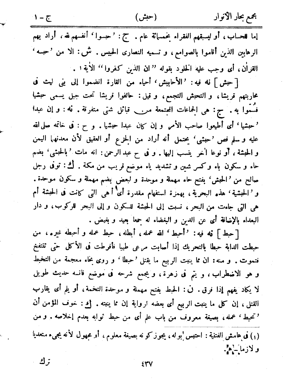 [حبش] نه فيه: "الأحابيش" أحياء من القارة انضموا إلى بني ليث في محاربتهم قريشاً، والتحبش التجمع، وقيل: حالفوا قريشاً تحت جبل يسمى حبشياً فسموا به. ج: هي الجماعات المجتمعة من قبائل شتى متفرقة. نه: وإن عبداً "حبشياً" أي أطيعوا صاحب الأمر وإن كان عبداً حبشياً. وح: في خاتمه صلى الله عليه وسلم فص "حبشي" يحتمل أنه أراد من الجزع أو العقيق لأن معدنهما اليمن والحبشة، أو نوعاً آخر ينسب إليها. وفي ح عبد الرحمن: أنه مات "بالحبشي" بضم حاء وسكون باء وكسر شين وتشديد ياء موضع قريب من مكة. ك: توفى رجل صالح من "الحبش" بفتح حاء مهملة وموحدة ولبعض بضم مهملة وسكون موحدة. و"الحبشية" هذه البحرية، بهمزة استفهام مقدرة أي أهي التي كانت في الحبشة أم هي التي جاءت من البحر، نسبت إلى الحبشة للسكون وإلى البحر للركوب، ودار البعداء بالإضافة أي عن الدين والبغضاء له جمعاً بعيد وبغيض.