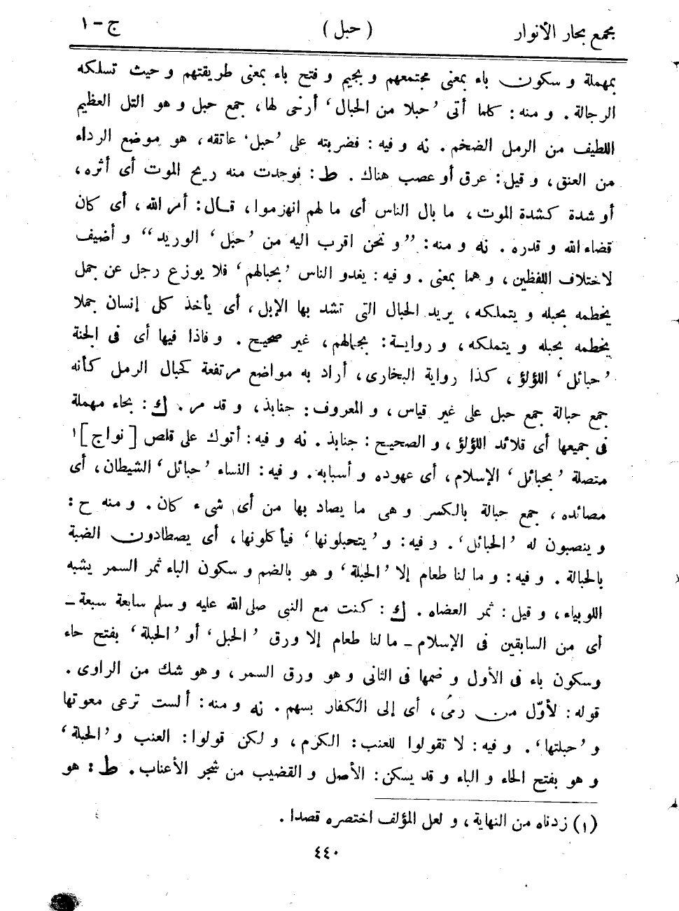 بمهملة وسكون باء بمعنى مجتمعهم وبجيم وفتح باء بمعنى طريقتهم وحيث تسلكه الرجالة. ومنه: كلما أتى "حبلاً من الحبال" أرخى لها، جمع حبل وهو التل العظيم اللطيف من الرمل الضخم. نه وفيه: فضربته على "حبل" عاتقه، هو موضع الرداء من العنق، وقيل: عرق أو عصب هناك. ط: فوجدت منه ريح الموت أي أثره، أو شدة كشدة الموت، ما بال الناس أي ما لهم انهزموا، قال: أمر الله، أي كان قضاء الله وقدره. نه ومنه: "ونحن أقرب إليه من "حبل" الوريد" وأضيف لاختلاف اللفظين، وهما بمعنى. وفيه: يغدو الناس "بحبالهم" فلا يوزع رجل عن جمل يخطمه بحبله ويتملكه، يريد الحبال التي تشد بها الإبل، أي يأخذ كل إنسان جملاً يخطمه بحبله ويتملكه، ورواية: بجمالهم، غير صحيح. وفإذا فيها أي في الجنة "حبائل" اللؤلؤ، كذا رواية البخاري، أراد به مواضع مرتفعة كحبال الرمل كأنه جمع حبالة جمع حبل على غير قياس، والمعروف: جنابذ، وقد مر. ك: بحاء مهملة في جميعها أي قلائد اللؤلؤ، والصحيح: جنابذ. نه وفيه: أتوك على قلص [نواج] متصلة "بحبائل" الإسلام، أي عهوده وأسبابه. وفيه: النساء "حبائل" الشيطان، أي مصائده، جمع حبالة بالكسر وهي ما يصاد بها من أي شيءكان. ومنه ح: وينصبون له "الحبائل". وفيه: و"يتحبلونها" فيأكلونها، أي يصطادون الضبة بالحبالة. وفيه: وما لنا طعام إلا "الحبلة" وهو بالضم وسكون الباء ثمر السمر يشبه اللوبياء، وقيل: ثمر العضاه. ك: كنت مع النبي صلى الله عليه وسلم سابعة سبعة- أي من السابقين في الإسلام- ما لنا طعام إلا ورق "الحبل" أو "الحبلة" بفتح حاء وسكون باء في الأول وضمها في الثاني وهو ورق السمر، وهو شك من الراوي. قوله: لأول من رمى، أي إلى الكفار بسهم. نه ومنه: ألست ترعى معوتها و"حبلتها". وفيه: لا تقولوا للعنب: الكرم، ولكن قولوا: العنب و"الحبلة" وهو بفتح الحاء والباء وقد يسكن: الأصل والقضيب من شجر الأعناب. ط: هو