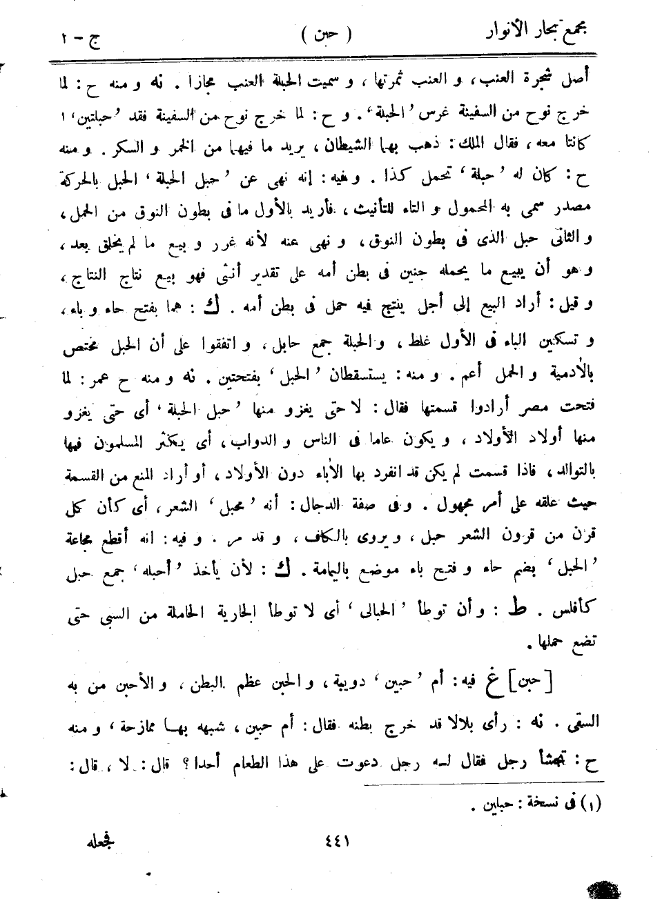 أصل شجرة العنب، والعنب ثمرتها، وسميت الحبلة العنب مجازاً. نه ومنه ح: لما خرج نوح من السفينة غرس "الحبلة". وح: لما خرج نوح من السفينة فقد "حبلتين" كانتا معه، فقال الملك: ذهب بهما الشيطان، يريد ما فيهما من الخمر والسكر. ومنه ح: كان له "حبلة" تحمل كذا. وفيه: إنه نهى عن "حبل الحبلة" الحبل بالحركة مصدر سمي به المحمول والتاء للتأنيث، فأريد بالأول ما في بطون النوق من الحمل، والثاني حبل الذي في بطون النوق، ونهى عنه لأنه غرر وبيع ما لم يخلق بعد، وهو أن يبيع ما يحمله جنين في بطن أمه على تقدير أنثى فهو بيع نتاج النتاج، وقيل: أراد البيع إلى اجل ينتج فيه حمل في بطن أمه. ك: هما بفتح حاء وباء، وتسكين الباء في الأول غلظ، والحبلة جمع حابل، واتفقوا على أن الحبل مختص بالآدمية والحمل أعم. ومنه: يستسقطان "الحبل" بفتحتين. نه ومنه ح عمر: لما فتحت مصر أرادوا قسمتها فقال: لا حتى يغزو منها "حبل الحبلة" أي حتى يغزو منها أولاد الأولاد، ويكون عاماً في الناس والدواب، أي يكثر المسلمون فيها بالتوالد، فإذا قسمت لم يكن قد انفرد بها الآباء دون الأولاد، أو أراد المنع من القسمة حيث علقه على أمر مجهول. وفي صفة الدجال: أنه "محبل" الشعر، أي كأن كل قرن من قرون الشعر حبل، ويروى بالكاف، وقد مر. وفيه: أنه أقطع مجاعة "الحبل" بضم حاء وفتح باء موضع باليمامة. ك: لأن يأخذ "أحبله" جمع حبل كأفلس. ط: وأن وطأ "الحبالى" أي لا توطأ الجارية الحاملة من السبي حتى تضع حملها.