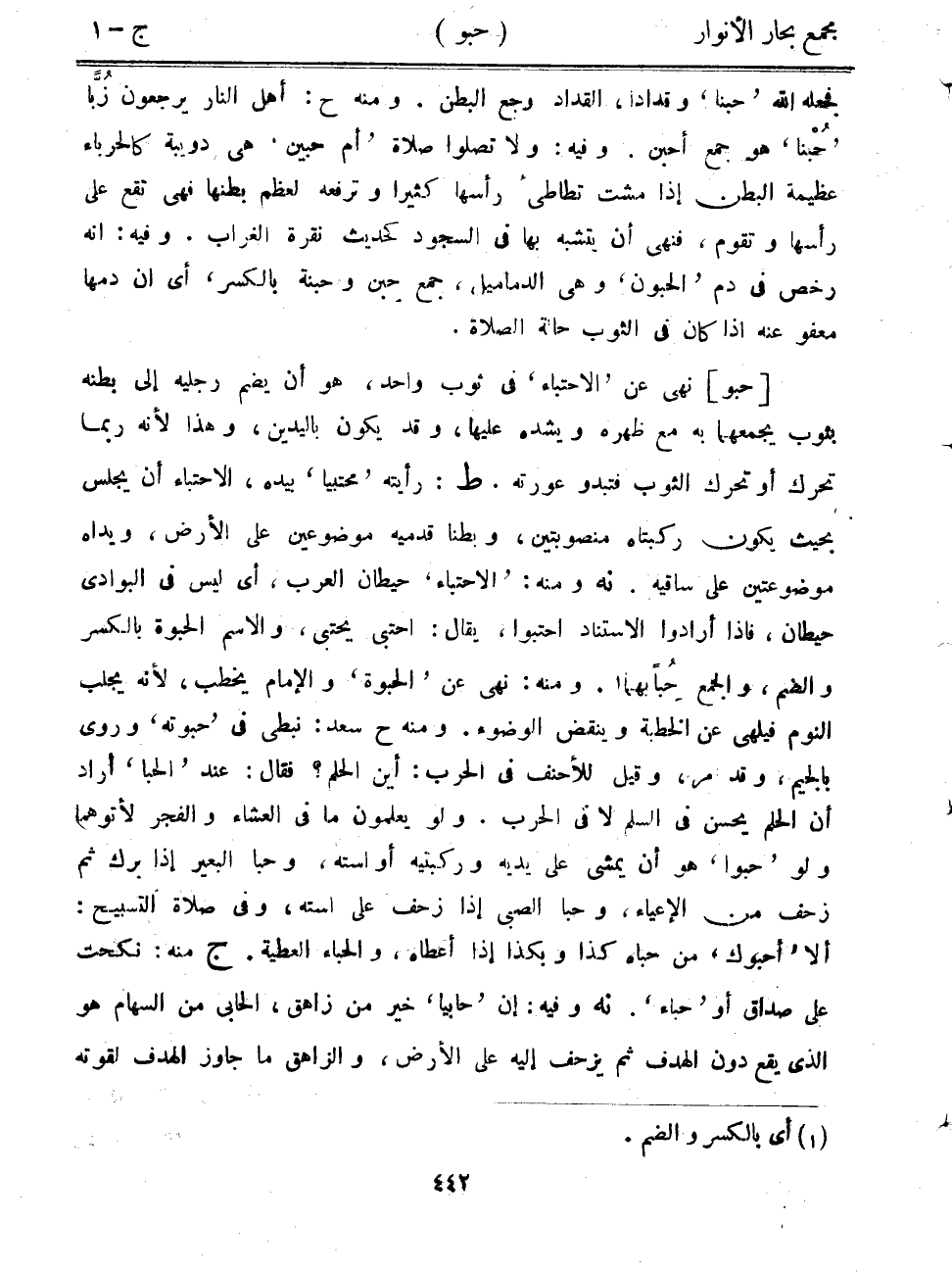 [حبو] نهى عن "الاختباء" في ثوب واحد، هو أن يضم رجليه إلى بطنه بثوب يجمعهما به مع ظهره ويشده عليها، وقد يكون باليدين، وهذا لأنه ربما تحرك أو تحرك الثوب فتبدو عورته. ط: رأيته "محتبياً" بيده، الاحتباء أن يجلس بحيث يكون ركبتاه منصوبتين، وبطنا قدميه موضوعين على الأرض، ويداه موضوعتين على ساقيه. نه ومنه: "الاحتباء" حيطان العرب، أي ليس في البوادي حيطان، فإذا أرادوا الاستناد احتبوا، يقال: احتبى يحتبي، والاسم الحبوة بالكسر والضم، والجمع حبابهما. ومنه: نهى عن "الحبوة" والإمام يخطب، لأنه يجلب النوم فيلهى عن الخطبة وينقض الوضوء. ومنه ح سعد: نبطي في "حبوته" وروى بالجيم، وقد مر، وقيل للأحنف في الحرب: أين الحلم؟ فقال: عند "الحبا" أراد أن الحلم يحسن في السلم لا في الحرب. ولو يعلمون ما في العشاء والفجر لأتوهما ولو "حبوا" هو أن يمشي على يديه وركبتيه أواسته، وحبا البعير إذا برك ثم زحف من الإعياء، وحبا الصبي إذا زحف على أسته، وفي صلاة التسبيح: ألا "أحبوك" من حباه كذا وبكذا إذا أعطاه، والحباء العطية. ج منه: نكحت على صداق أو "حباء". نه وفيه: إن "حابيا" خير من زاهق، الحابي من السهام هو الذي يقع دون الهدف ثم يزحف إليه على الأرض، والزاهق ما جاوز الهدف لقوته