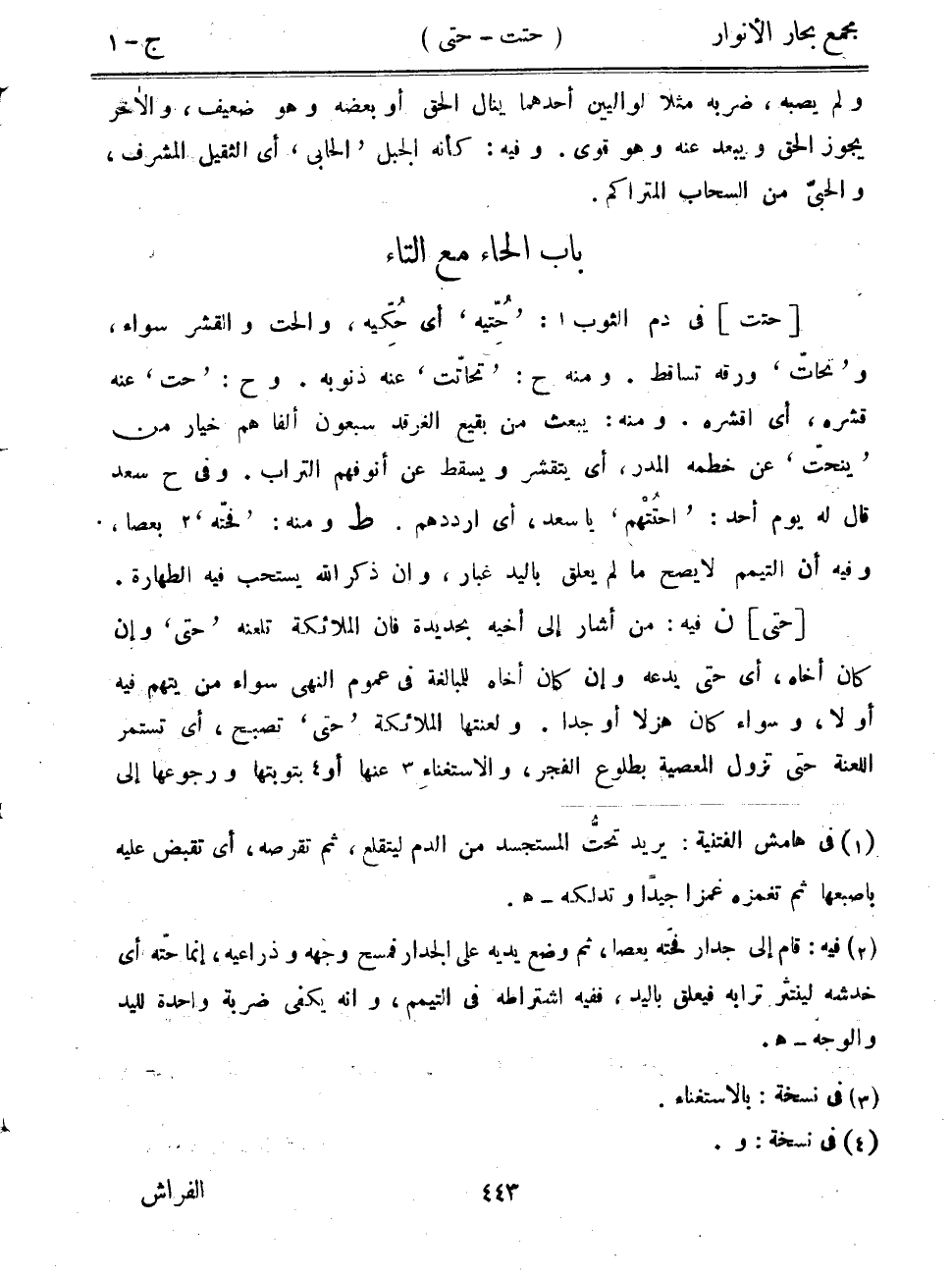 [حتت] في دم الثوب: "حتيه" أي حكيه، والحت والقشر سواء، و"تحات" ورقه تساقط. ومنه ح: "تحاتت" عنه ذنوبه. وح: "حت" عنه قشره، أي اقشره. ومنه: يبعث من بقيع الغرقد سبعون ألفاً هم خيار من "ينحت" عن خطمه المدر، أي يتقشر ويسقط عن أنوفهم التراب. وفي ح سعد قال له يوم أحد: "احتتهم" يا سعد، أي ارددهم. ط ومنه: "فحته" بعصا، وفيه أن التيمم لا يصح ما لم يعلق باليد غبار، وأن ذكر الله يستحب فيه الطهارة.