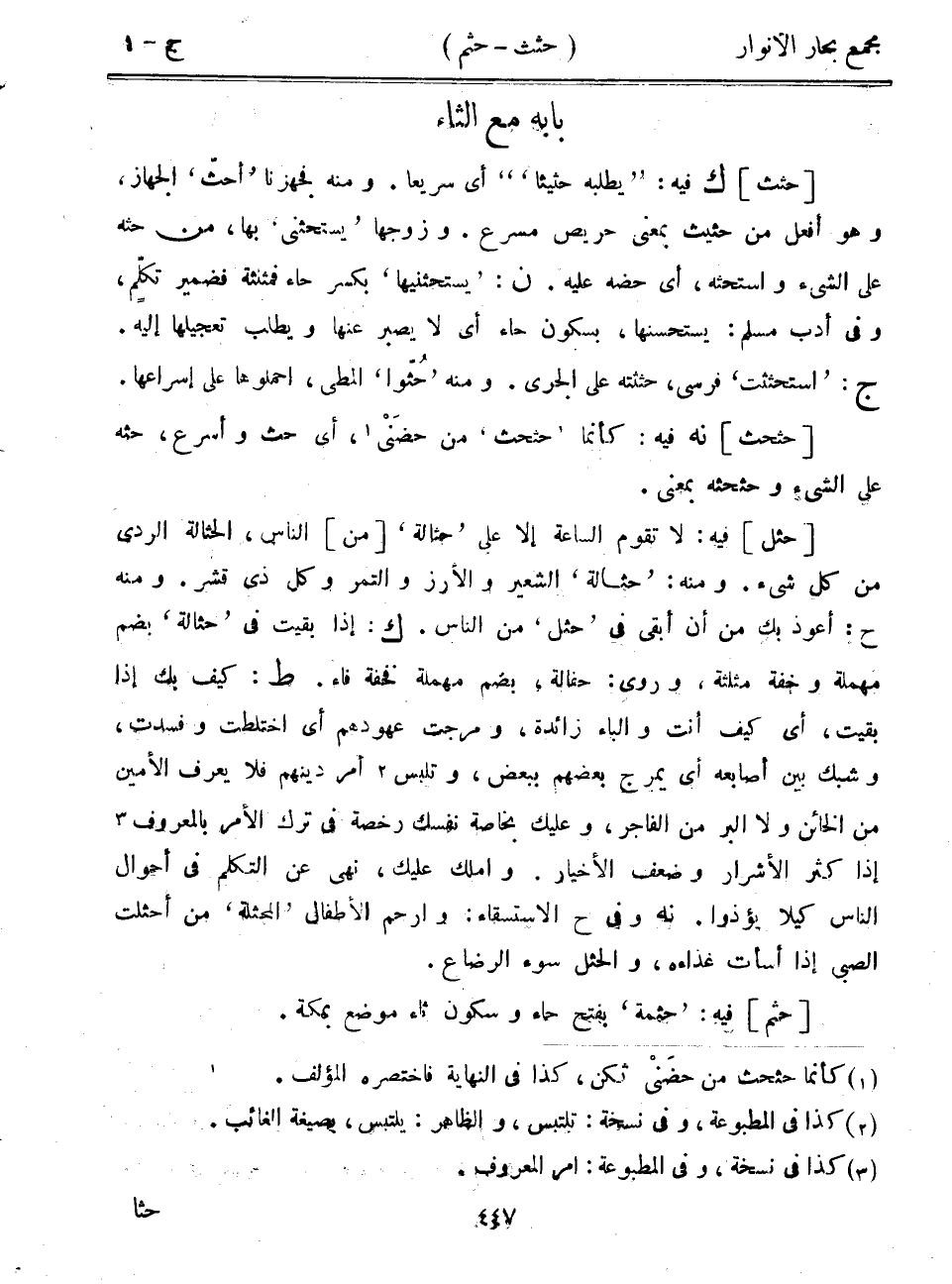 [حثل] فيه: لا تقوم الساعة إلا على "حثالة" [من] الناس، الحثالة الردي من كل شيء. ومنه: "حثالة" الشعير والأرز والتمر وكل ذي قشر. ومنه ح: أعوذ بك من أن أبقى في "حثل" من الناس. ك: إذا بقيت في "حثالة" بضم مهملة وخفة مثلثة، وروى: حفالة، بضم مهملة فخفة فاء. ط: كيف بك إذا بقيت، أي كيف أنت والباء زائدة، ومرجت عهودهم أي اختلطت وفسدت، وشبك بين أصابعه أي يمرج بعضهم ببعض، وتلبس أمر دينهم فلا يعرف الأمين من الخائن ولا البر من الفاجر، وعليك بخاصة نفسك رخصة في ترك الأمر بالمعروف إذا كثر الأشرار وضعف الأخيار. وأملك عليك، نهى عن التكلم في أحوال الناس كيلا يؤذوا. نه وفي ح الاستسقاء: وارحم الأطفال "المحثلة" من أحثلت الصبي إذا أسأت غذاءه، والحثل سوء الرضاع.