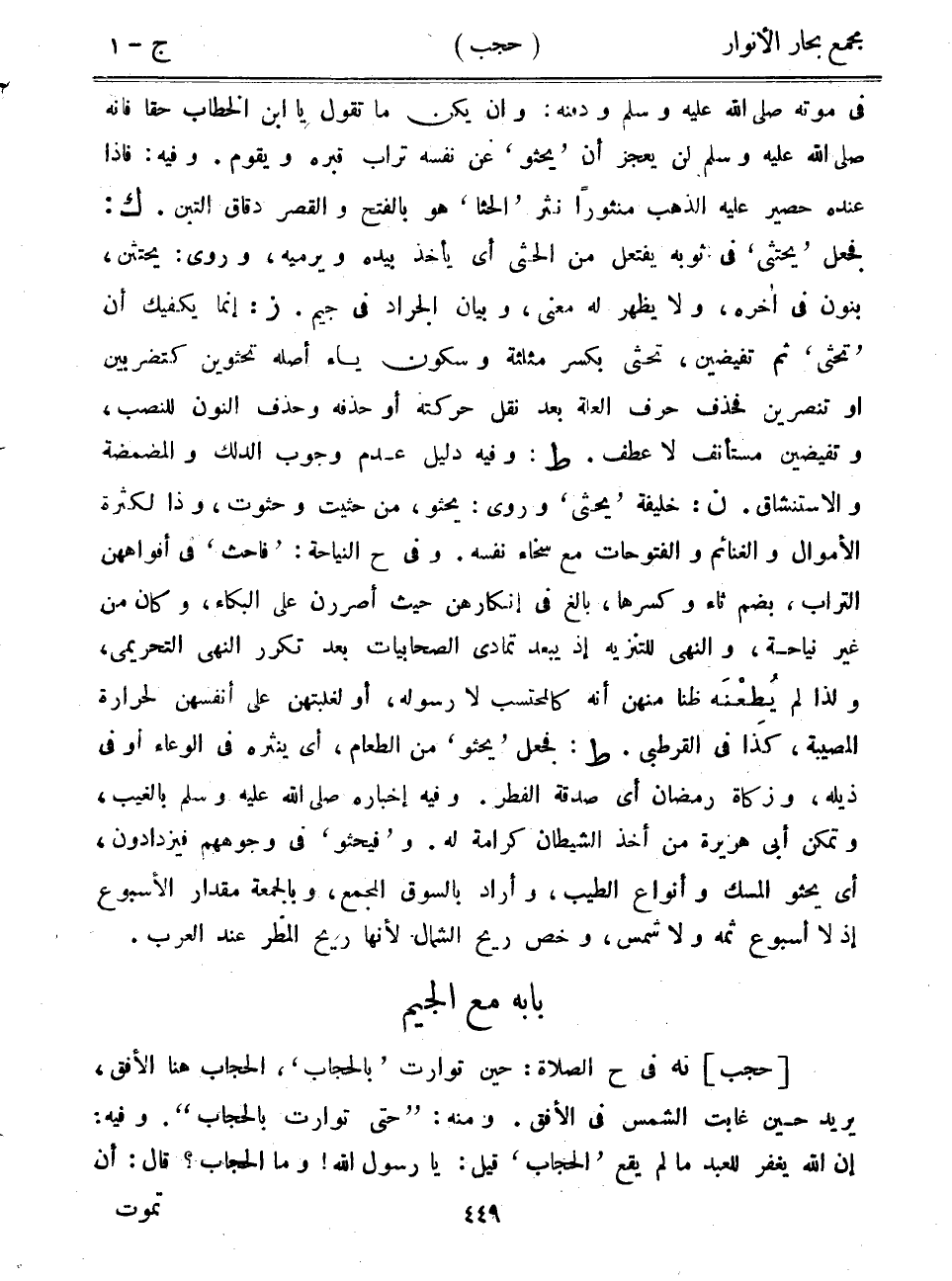 [حجب] نه في ح الصلاة: حين توارت "بالحجاب"، الحجاب هنا الأفق، يريد حين غابت الشمس في الأفق. ومنه: "حتى توارت بالحجاب". وفيه: إن الله يغفر للعبد ما لم يقع "الحجاب" قيل: يا رسول الله! وما الحجاب؟ قال: أن