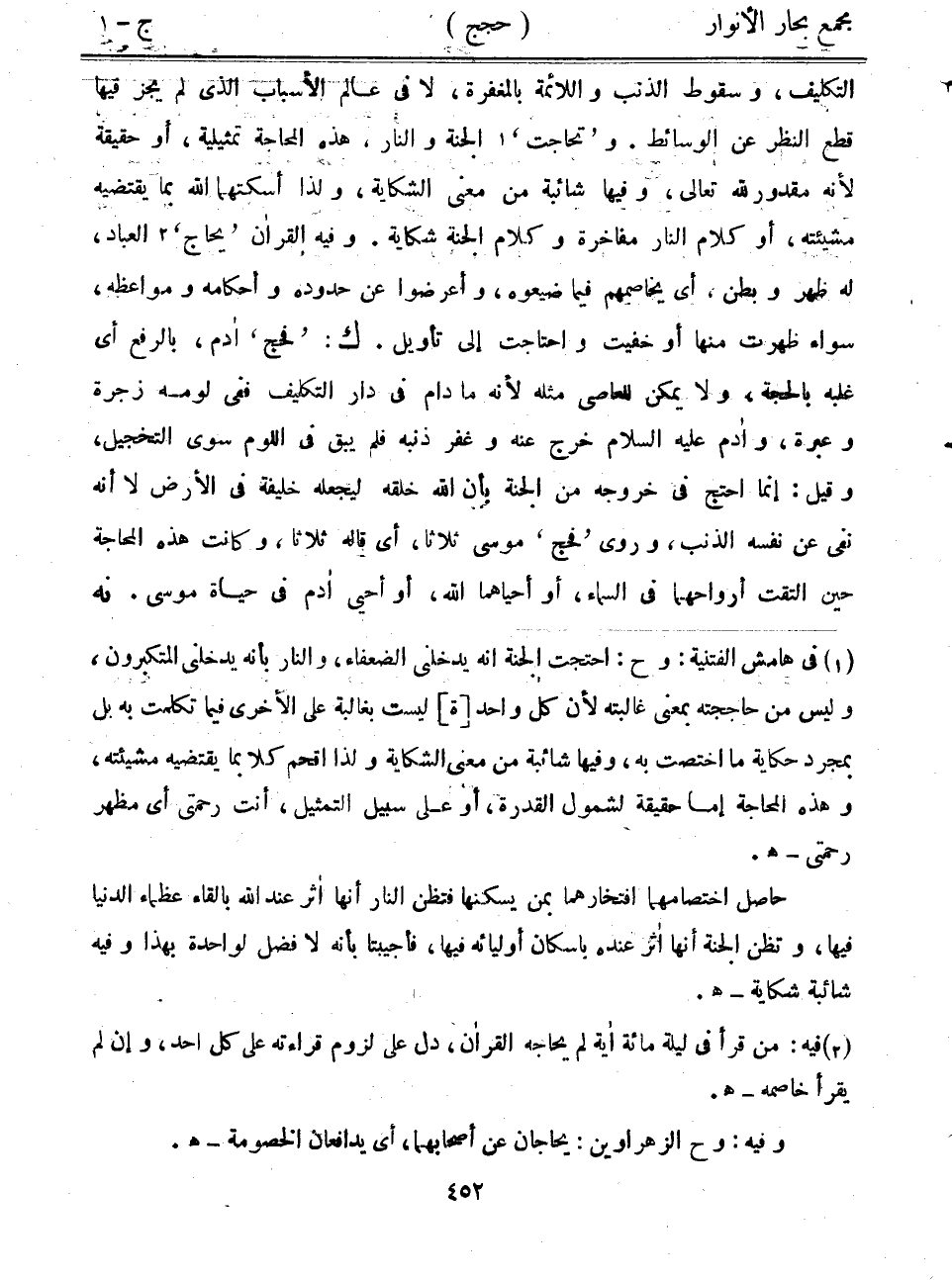 التكليف، وسقوط الذنب واللائمة بالمغفرة، لا في عالم الأسباب الذي لم يجز فيها قطع النظر عن الوسائط. و"تحاجت" الجنة والنار، هذه المحاجة تمثيلية، أو حقيقة لأنه مقدور لله تعالى، وفيها شائبة من معنى الشكاية، ولذا أسكتهما الله بما يقتضيه مشيئته، أو كلام النار مفاخرة وكلام الجنة شكاية. وفيه القرآن "يحاج" العباد، له ظهر وبطن، أي يخاصمهم فيما ضيعوه، وأعرضوا عن حدوده وأحكامه ومواعظه، سواء ظهرت منها أو خفيت واحتاجت إلى تأويل. ك: "فحج" آدم، بالرفع أي غلبه بالحجة، ولا يمكن للعاصي مثله لأنه ما دام في دار التكليف ففي لومه زجرة وعبرة، وآدم عليه السلام خرج عنه وغفر ذنبه فلم يبق في اللوم سوى التخجيل، وقيل: إنما احتج في خروجه من الجنة بأن الله خلقه ليجعله خليفة في الأرض لا أنه نفى عن نفسه الذنب، وروى "فحج" موسى ثلاثاً، أي قاله ثلاثا، وكانت هذه المحاجة حين التقت أرواحهما في السماء، أو أحياهما الله، أو أحيي آدم في حياة موسى. نه