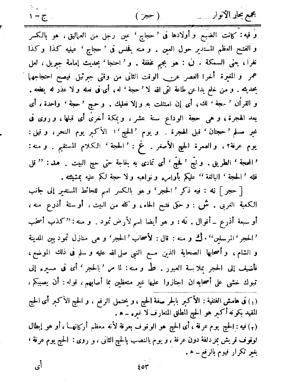 وفيه: كانت الضبع وأولادها في "حجاج" عين رجل من العماليق، هو بالكسر والفتح العظم المستدير حول العين. ومنه فجلس في "حجاج" عينيه كذا وكذا نفراً، يعني السمكة. ن: هو بجيم مخففة. و"احتجا" بحديث إمامة جبريل، لعل عمر والمغيرة أخرا العصر عن الوقت الثاني من وقتي جبرئيل فيصح احتجاجهما بحديثه. ومن خلع يداً عن طاعة لقي الله لا "حجة" له، أي في فعله ولا عذر له ينفعه. والقرآن "حجة" لك، أي إن امتثلت به وإلا فعليك. وحج "حجة" واحدة، أي بعد الهجرة، وهي حجة الوداع سنة عشر، وبمكة أخرى أي قبلها، وروى في غير مسلم "حجتان" قبل الهجرة. ويوم "الحج" الأكبر يوم النحر، وقيل: يوم عرفة، والعمرة الحج الأصغر. غ: "الحجة" الكلام المستقيم. ومنه: "المحجة" الطريق. ولج "فحج" أي تمادى به لجاجة حتى حج البيت. مد: "قل فلله "الحجة" البالغة" عليكم بأوامره ونواهيه ولا حجة لكم عليه بمشيئته.