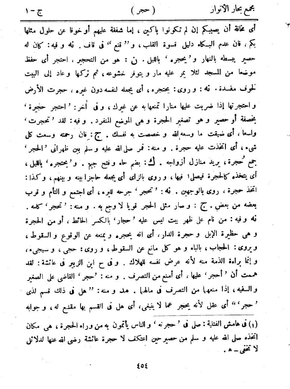 أي مخافة أن يصيبكم إن لم تكونوا باكين، إما شفقة عليهم أو خوفاً عن حلول مثلها بكم، فإن عدم البكاء دليل قسوة القلب، و"قنع" في قاف. نه وفيه: كان له حصير يبسطه بالنهار و"يحجره" بالليل. ن: هو من التحجير، احتجر أي حفظ موضعاً من المسجد لئلا يمر عليه مار ويتوفر خشوعه، ثم تركها وعاد إلى البيت لخوف مفسدة. نه: وروى: يحتجره، أي يجعله لنفسه دون غيره، حجرت الأرض واحتجرتها إذا ضربت عليها مناراً تمنعها به عن غيرك، وفي آخر: "احتجر حجيرة" بخصفة أو حصير وهو تصغير الحجرة وهي الموضع المنفرد. وفيه: لقد "تحجرت" واسعاً، أي ضيقت ما وسعه الله وخصصت به نفسك. ج: فإن رحمته وسعت كل شيء، أي اتخذت عليه حجرة. ومنه: فمر صلى الله عليه وسلم بين ظهراني "الحجر" جمع حجرة، يريد منازل أزواجه. ك: بضم حاء وفتح جيم. و"يحتجره" بالليل، أي يتخذه كالحجرة فيصلي فيها، وروى بالزاي أي يجعله حاجزاً بينه وبينهم، وكذا: اتخذ حجرة، روى بالوجهين. نه: "تحجر" جرحه للبرء، أي اجتمع والتأم وقرب بعضه من بعض. ج: وصار مثل الحجر قوياً لا وجع به. ومنه: "تحجر" كلمه. نه وفيه: من نام على ظهر بيت ليس عليه "حجار" بالكسر الحائط، أو من الحجرة وهي حظيرة الإبل وحجرة الدار، أي أنه يحجره ويمنعه عن الوقوع والسقوط، ويروى: الحجاب، بالباء وهو كل مانع عن السقوط، وروى: حجي، وسيجيء، وإنما براءة الذمة منه لأنه عرض نفسه للهلاك. وفي ح ابن الزبير في عائشة: لقد هممت أن "أحجر" عليها، أي أمنع من التصرف. ومنه: "حجر" القاضي على الصغير والسفيه، إذا منعهما من التصرف في مالهما. مد ومنه: "هل في ذلك قسم لذي "حجر"" أي عقل لأنه يحجر عما لا ينبغي، أي هل في القسم بها مقنع له، وجوابه