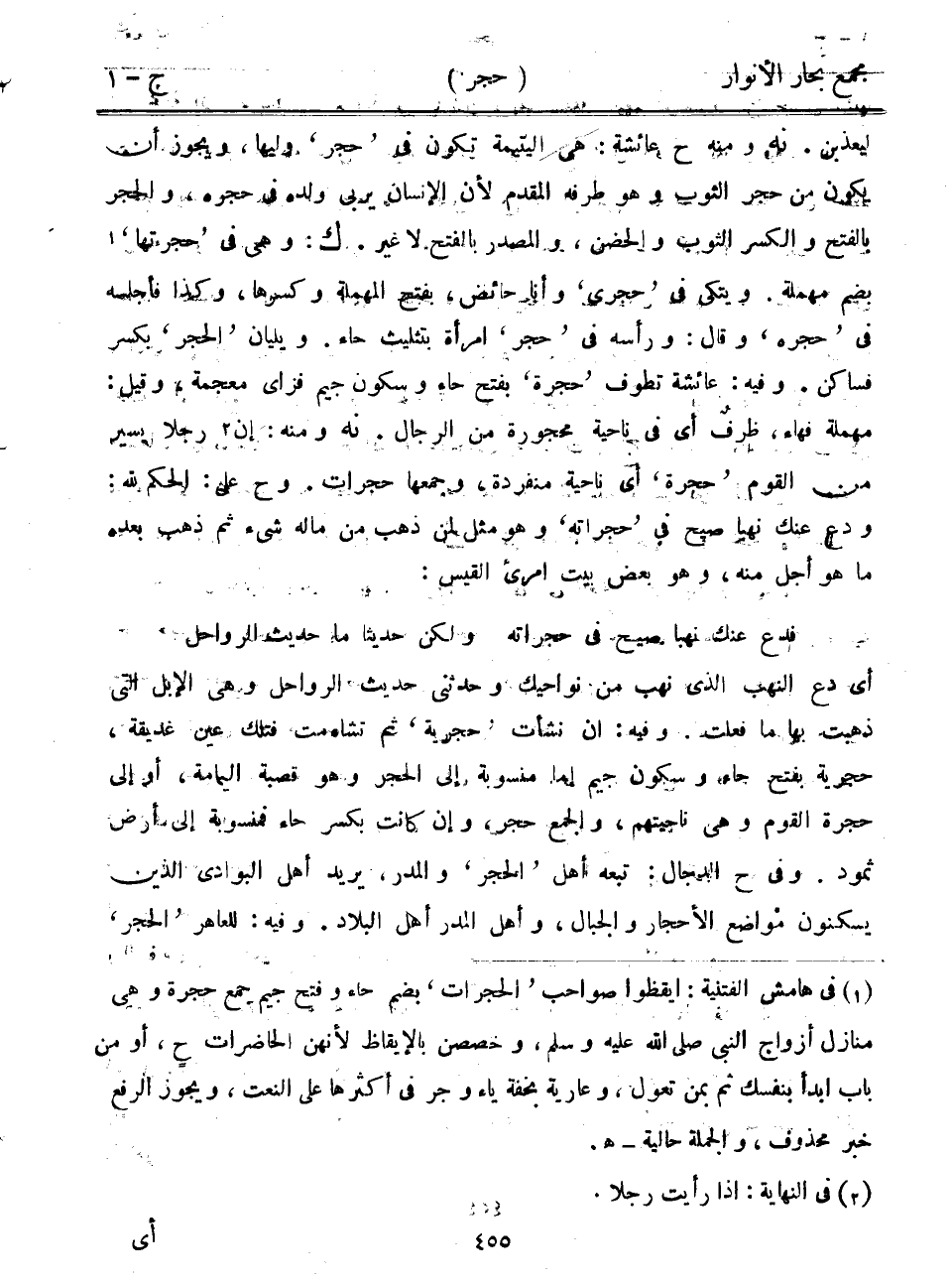 أي دع النهب الذي نهب من نواحيك وحدثني حديث الرواحل وهي الإبل التي ذهبت بها ما فعلت. وفيه: إن نشأت "حجرية" ثم تشاءمت فتلك عين غديقة، حجرية بفتح جاء، وسكون جيم إما منسوبة إلى الحجر وهو قصبة اليمامة، أو إلى حجرة القوم وهي ناجيتهم، والجمع حجر، وإن كانت بكسر حاء فمنسوبة إلى أرض ثمود. وفي ح الدجال: تبعه أهل "الحجر" والمدر، يريد أهل البوادي الذين يسكنون مواضع الأحجار والجبال، وأهل المدر أهل البلاد. وفيه: للعاهر "الحجر"