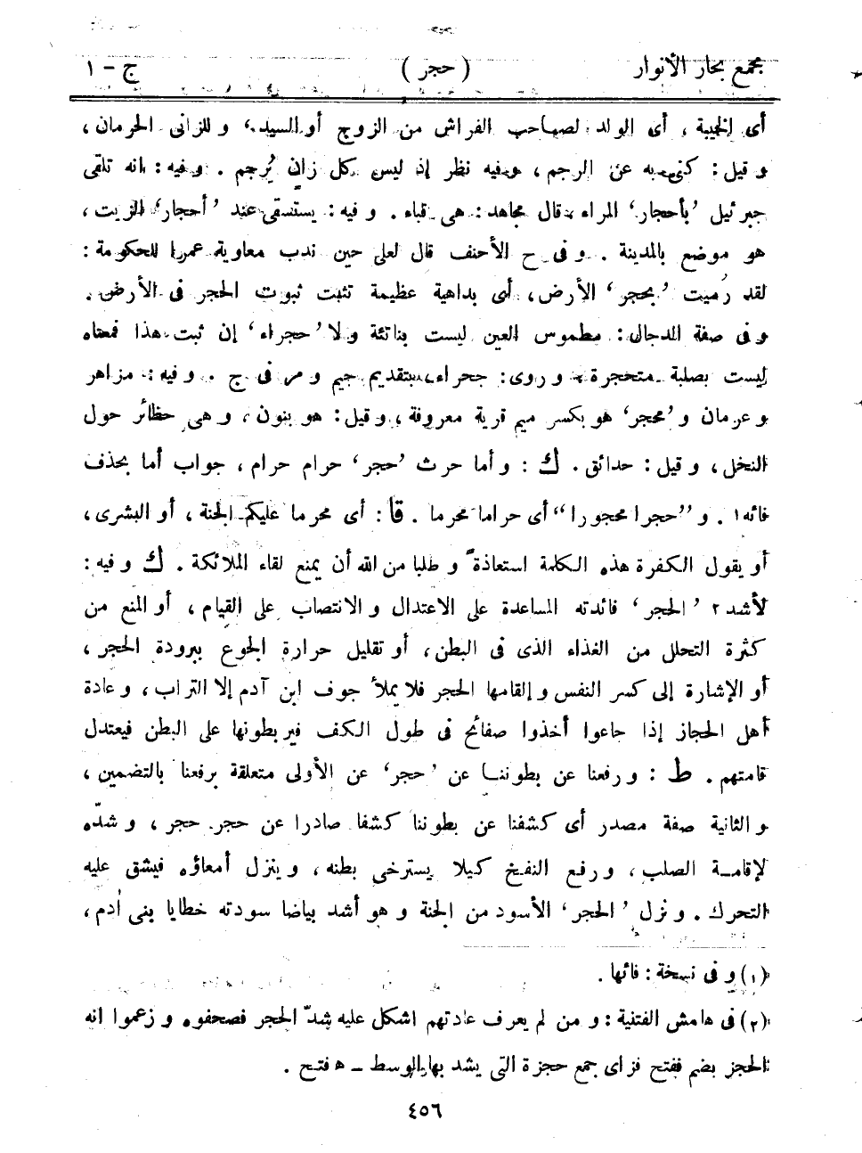أي الخيبة، أي الولد لصاحب الفراش من الزوج أو السيد، وللزاني الحرمان، وقيل: كني به عن الرجم، وفيه نظر إذ ليس كل زان يُرجم. وفيه: أنه تلقى جبرئيل "بأحجار" المراء، قال مجاهد: هي قباء. وفيه: يستسقى عند "أحجار" الزيت، هو موضع بالمدينة. وفي ح الأحنف قال لعلي حين ندب معاوية عمرا للحكومة: لقد رميت "بحجر" الأرض، أي بداهية عظيمة تثبت ثبوت الحجر في الأرض. وفي صفة الدجال: مطموس العين ليست بناتئة ولا "حجراء" إن ثبت هذا فمعناه ليست بصلبة متحجرة، وروى: جحراء، بتقديم جيم ومر في ج. وفيه: مزاهر وعرمان و"محجر" هو بكسر ميم قرية معروفة، وقيل: هو بنون، وهي حظائر حول النخل، وقيل: حدائق. ك: وأما حرث "حجر" حرام حرام، جواب أما بحذف فائه. و"حجراً محجورا" أي حراماً محرماً. قا: أي محرما عليكم الجنة، أو البشرى، أو يقول الكفرة هذه الكلمة استعاذة وطلباً من الله أن يمنع لقاء الملائكة. ك وفيه: لأشد "الحجر" فائدته المساعدة على الاعتدال والانتصاب على القيام، أو المنع من كثرة التحلل من الغذاء الذي في البطن، أو تقليل حرارة الجوع ببرودة الحجر، أو الإشارة إلى كسر النفس وإلقامها الحجر فلا يملأ جوف ابن آدم إلا التراب، وعادة أهل الحجاز إذا جاعوا أخذوا صفائح في طول الكف فيربطونها على البطن فيعتدل قامتهم. ط: ورفعنا عن بطوننا عن "حجر" عن الأولى متعلقة برفعنا بالتضمين، والثانية صفة مصدر أي كشفنا عن بطوننا كشفاً صادراً عن حجر حجر، وشده لإقامة الصلب، ورفع النفخ كيلا يسترخي بطنه، وينزل أمعاؤه فيشق عليه التحرك. ونزل "الحجر" الأسود من الجنة وهو أشد بياضاً سودته خطايا بني آدم،