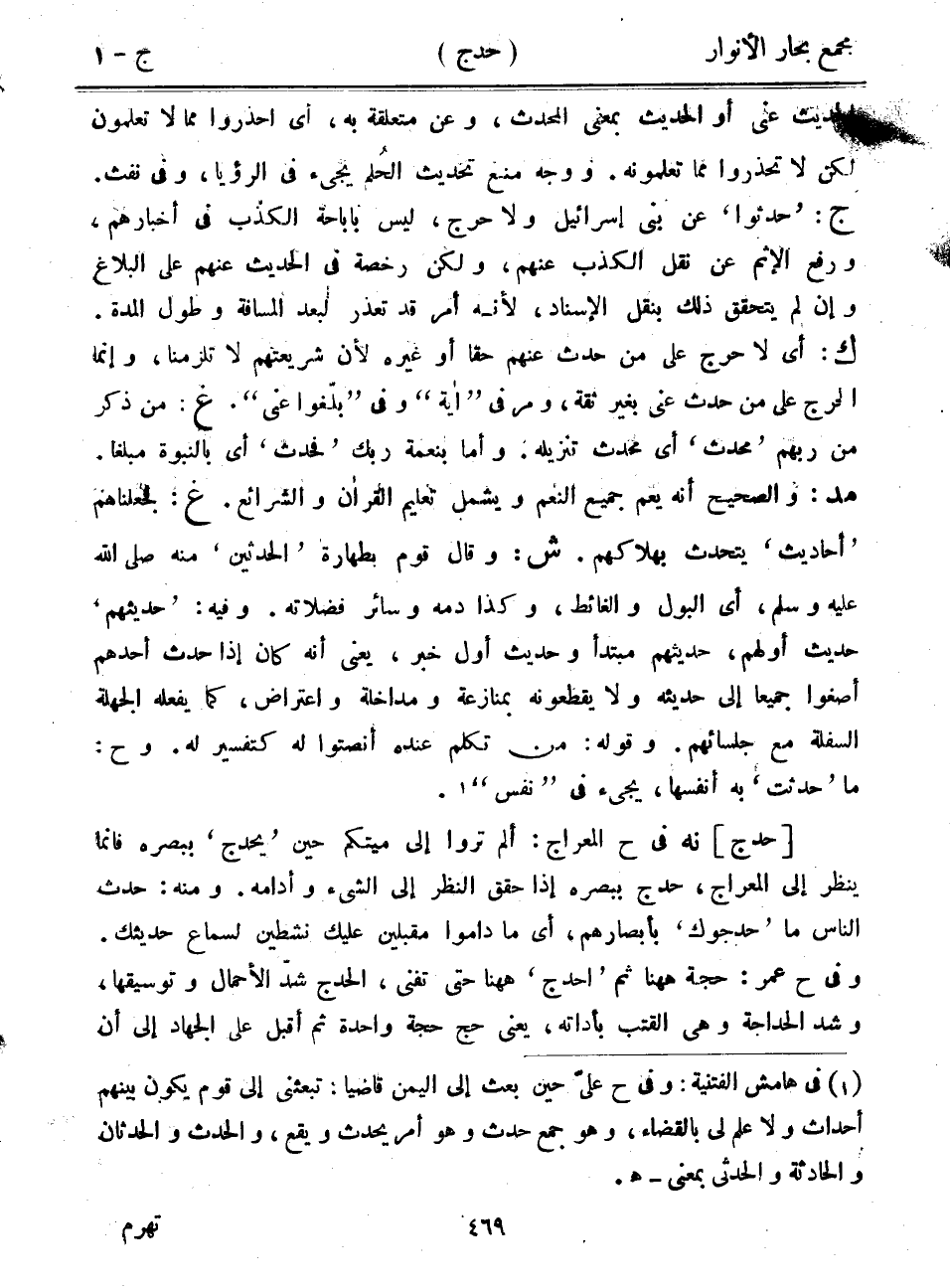 الحديث عني أو الحديث بمعنى المحدث، وعن متعلقة به، أي احذروا مما لا تعلمون لكن لا تحذروا مما تعلمونه. ووجه منع تحديث الحلم يجيء في الرؤيا، وفي نفث. ج: "حدثوا" عن بني إسرائيل ولا حرج، ليس بإباحة الكذب في أخبارهم، ورفع الإثم عن نقل الكذب عنهم، ولكن رخصة في الحديث عنهم على البلاغ وإن لم يتحقق ذلك بنقل الإسناد، لأنه أمر قد تعذر لبعد المسافة وطول المدة. ك: أي لا حرج على من حدث عنهم حقاً أو غيره لأن شريعتهم لا تلزمنا، وإنما الحرج على من حدث عني بغير ثقة، ومر في "آية" وفي "بلغوا عني". غ: من ذكر من ربهم "محدث" أي محدث تنزيله. وأما بنعمة ربك "فحدث" أي بالنبوة مبلغاً. مد: والصحيح أنه يعم جميع النعم ويشمل تعليم القرآن والشرائع. غ: فجعلناهم "أحاديث" يتحدث بهلاكهم. ش: وقال قوم بطهارة "الحدثين" منه صلى الله عليه وسلم، أي البول والغائط، وكذا دمه وسائر فضلاته. وفيه: "حديثهم" حديث أولهم، حديثهم مبتدأ وحديث أول خبر، يعني أنه كان إذا حدث أحدهم أصغوا جميعاً إلى حديثه ولا يقطعونه بمنازعة ومداخلة واعتراض، كما يفعله الجهلة السفلة مع جلسائهم. وقوله: من تكلم عنده أنصتوا له كتفسير له. وح: ما "حدثت" به أنفسها، يجيء في "نفس".
