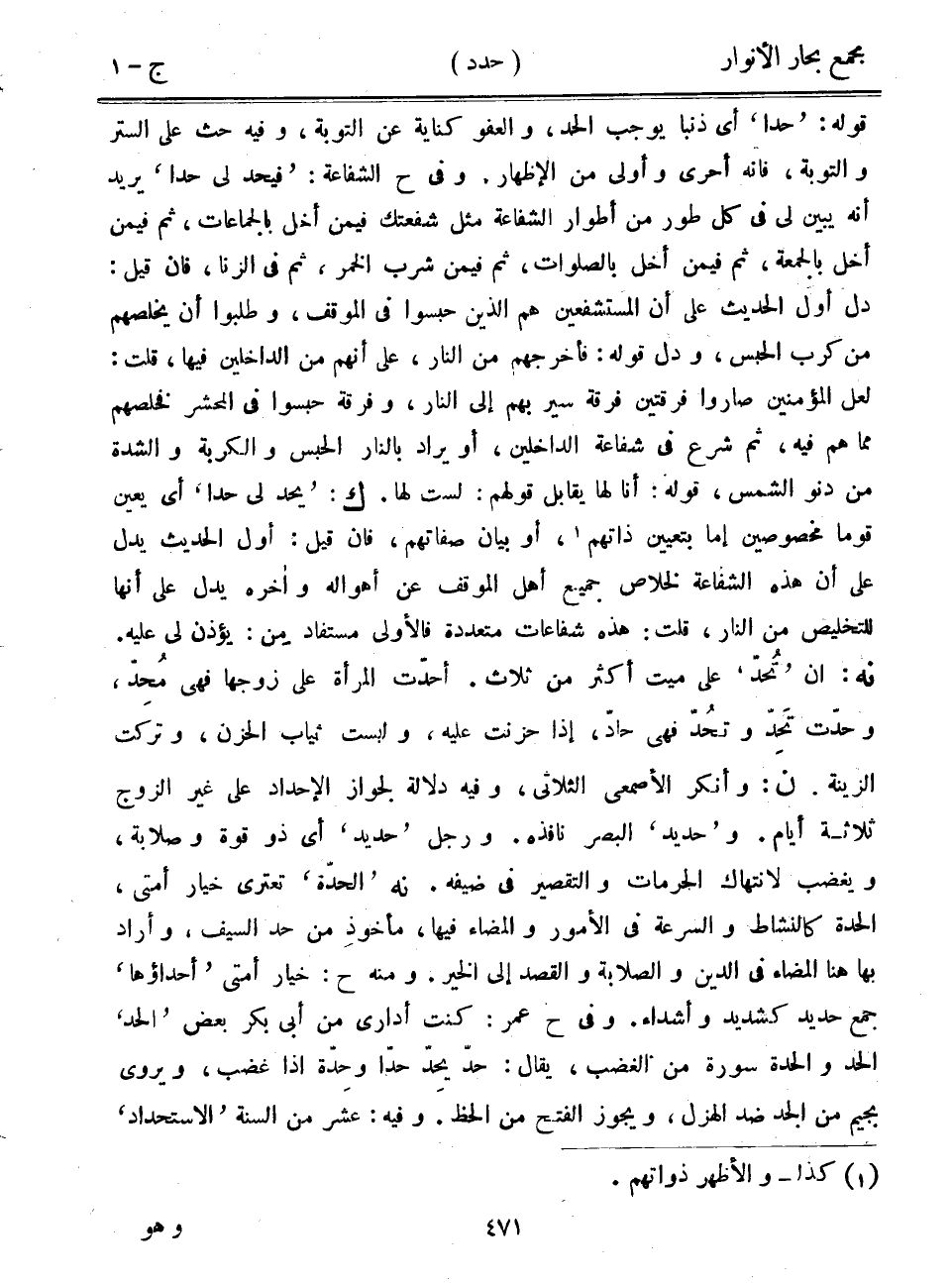 قوله: "حدا" أي ذنباً يوجب الحد، والعفو كناية عن التوبة، وفيه حث على الستر والتوبة، فإنه أحرى وأولى من الإظهار، وفي ح الشفاعة: "فيحد لي حداً" يريد أنه يبين لي في كل طور من أطوار الشفاعة مثل شفعتك فيمن أخل بالجماعات، ثم فيمن أخل بالجمعة، ثم فيمن أخل بالصوات، ثم فيمن شرب الخمر، ثم في الزنا، فإن قيل: دل أول الحديث على أن المستشفعين هم الذين حبسوا في الموقف، وطلبوا أن يخلصهم من كرب الحبس، ودل قوله: فأخرجهم من النار، على انهم من الداخلين فيها، قلت: لعل المؤمنين صاروا فرقتين فرقة سير بهم إلى النار، وفرقة حبسوا في المحشر فخلصهم مما هم فيه، ثم شرع في شفاعة الداخلين، أو يراد بالنار الحبس والكربة والشدة من دنو الشمس، قوله: أنا لها يقابل قولهم: لست لها. ك: "يحد لي حداً" أي يعين قوماً مخصوصين إما بتعيين ذاتهم، أو بيان صفاتهم، فإن قيل: أول الحديث يدل على أن هذه الشفاعة لخلاص جميع أهل الموقف عن أهواله وآخره يدل على أنها للتخليص من النار، قلت: هذه شفاعات متعددة فالأولى مستفاد من: يؤذن لي عليه. نه: أن "تحد" على ميت أكثر من ثلاث. أحدت المرأة على زوجها فهي محد، وحدت تحد وتحد فهي حاد، إذا حزنت عليه، ولبست ثياب الحزن، وتركت الزينة. ن: وأنكر الأصمعي الثلاثي، وفيه دلالة لجواز الإحداد على غير الزوج ثلاثة أيام. و"حديد" البصر نافذه. ورجل "حديد" أي ذو قوة وصلابة، ويغضب لانتهاك الحرمات والتقصير في ضيفه. نه "الحدة" تعتري خيار أمتي، الحدة كالنشاط والسرعة في الأمور والمضاء فيها، مأخوذ من حد السيف، وأراد بها هنا المضاء في الدين والصلابة والقصد إلى الخير. ومنه ح: خيار أمتي "أحداؤها" جمع حديد كشديد وأشداء. وفي ح عمر: كنت أداري من أبي بكر بعض "الحد" الحد والحدة سورة من الغضب، يقال: حد يحد حداً وحدة إذا غضب، ويروي بجيم من الجد ضد الهزل، ويجوز الفتح من الحظ. وفيه: عشر من السنة "الاستحداد"