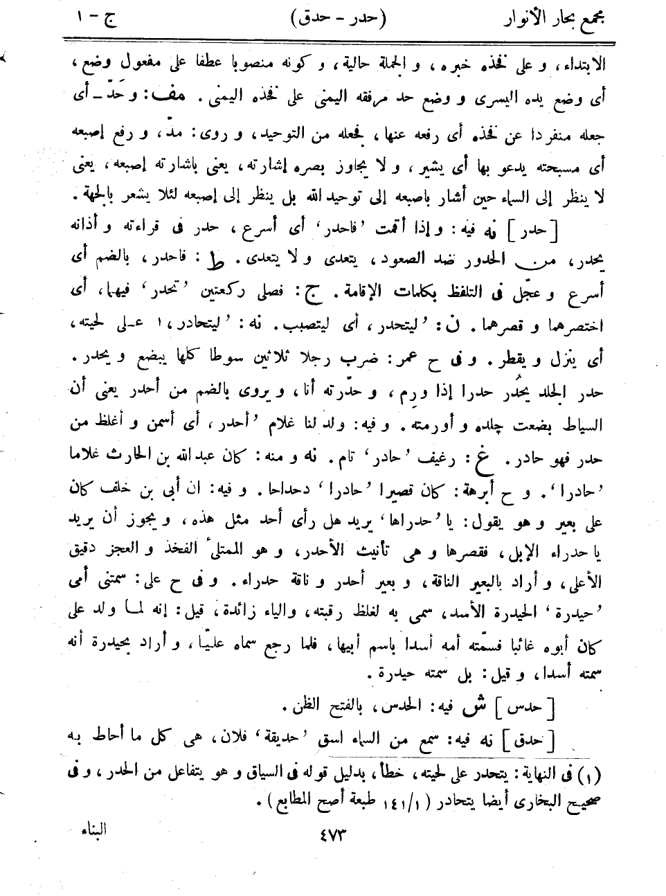[حدر] نه فيه: وإذا أقمت "فاحدر" أي أسرع، حدر في قراءته وأذانه يحدر، من الحدور ضد الصعود، يتعدى ولا يتعدى. ط: فاحدر، بالضم أي أسرع وعجل في التلفظ بكلمات الإقامة. ج: فصلى ركعتين "تحدر" فيهما، أي اختصرهما وقصرهما. ن: "ليتحدر" أي ليتصبب. نه: "ليتحادر" على لحيته، أي ينزل ويقطر. وفي ح عمر: ضرب رجلاً ثلاثين سوطاً كلها يبضع ويحدر. حدر الجلد يحدر حدراً إذا ورم، وحدرته أنا، ويروى بالضم من أحدر يعني أن السياط بضعت جلده وأورمته. وفيه: ولد لنا غلام "أحدر" أي أسمن وأغلظ من حدر فهو حادر. غ: رغيف "حادر" تام. نه ومنه: كان عبد الله بن الحارث غلاماً "حادراً". وح أبرهة: كان قصيراً "حادراً" دحداحاً. وفيه: إن أبي بن خلف كان على بعير وهو يقول: يا "حدراها" يريد هل رأى أحد مثل هذه، ويجوز أن يريد يا حدراء الإبل، فقصرها وهي تأنيث الأحدر، وهو الممتلئ الفخذ والعجز دقيق الأعلى، وأراد بالبعير الناقة، وبعير أحدر وناقة حدراء. وفي ح على: سمتني أمي "حيدرة" الحيدرة الأسد، سمي به لغلظ رقبته، والياء زائدة، قيل: إنه لما ولد علي كان أبوه غائباً فسمته أمه أسداً باسم أبيها، فلما رجع سماه علياً، وأراد بحيدرة أنه سمته أسداً، وقيل: بل سمته حيدرة.