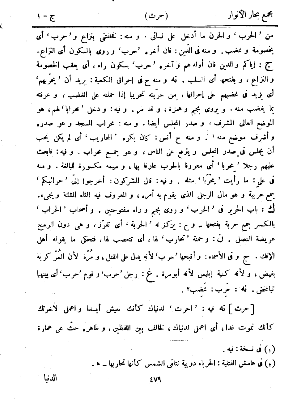 من "الحرب" والحزن ما أدخل على نسائي. ومنه: فخلفتني بنزاع و"حرب" أي بخصومة وغضب. ومنه في الدين: فإن أخره "حرب" وروى بالسكون أي النزاع. ج: إياكم والدين فإن أوله هم وآخره "حرب" بسكون راء، أي يعقب الخصومة والنزاع، وبفتحها أي السلب. نه ومنه ح في إحراق الكعبة: يريد أن "يحربهم" أي يزيد في غضبهم على إحراقها، من حربته تحريباً إذا حملته على الغضب، وعرفته بما يغضب منه. ويروى بجيم وهمزة، وقد مر. وفيه: ودخل "محراباً" لهم، هو الموضع العالي المشرف، وصدر المجلس أيضاً. ومنه: محراب المسجد وهو صدره وأشرف موضع منه. ومه ح أنس: كان يكره "المحاريب" أي لم يكن يحب أن يجلس في صدر المجلس ويترفع على الناس، وهو جمع محراب. وفيه: فابعث عليهم رجلاً "محرباً" أي معروفاً بالحرب عارفاً بها، وميمه مكسورة للمبالغة. ومنه في علي: ما رأيت "محرباً" مثله. وفيه: قال المشركون: أخرجوا إلي "حرائبكم" جمع حريبة وهو مال الرجل الذي يقوم به أمره، والمعروف فيه الثاء المثلثة ويجيء. ك: باب الحرير في "الحرب" وروى بجيم وراء مفتوحتين. وأصحاب "الحراب" بالكسر جمع حربة بفتحها- وح: يركز له "الحربة" أي تغرز، وهي دون الرمح عريضة النصل. ن: وحمنة "تحارب" لها، أي تتعصب لها، فتحكى ما يقوله أهل الإفك. ج وفي الأسماء: وأقبحها "حرب" لأنه يدل على القتل، ومرة لأن المر كريه بغيض، ولأنه كنية إبليس لأنه أبو مرة. غ: رجل "حرب" وقوم "حرب" أي بينهما تباغض. نه: حرب: غضب.