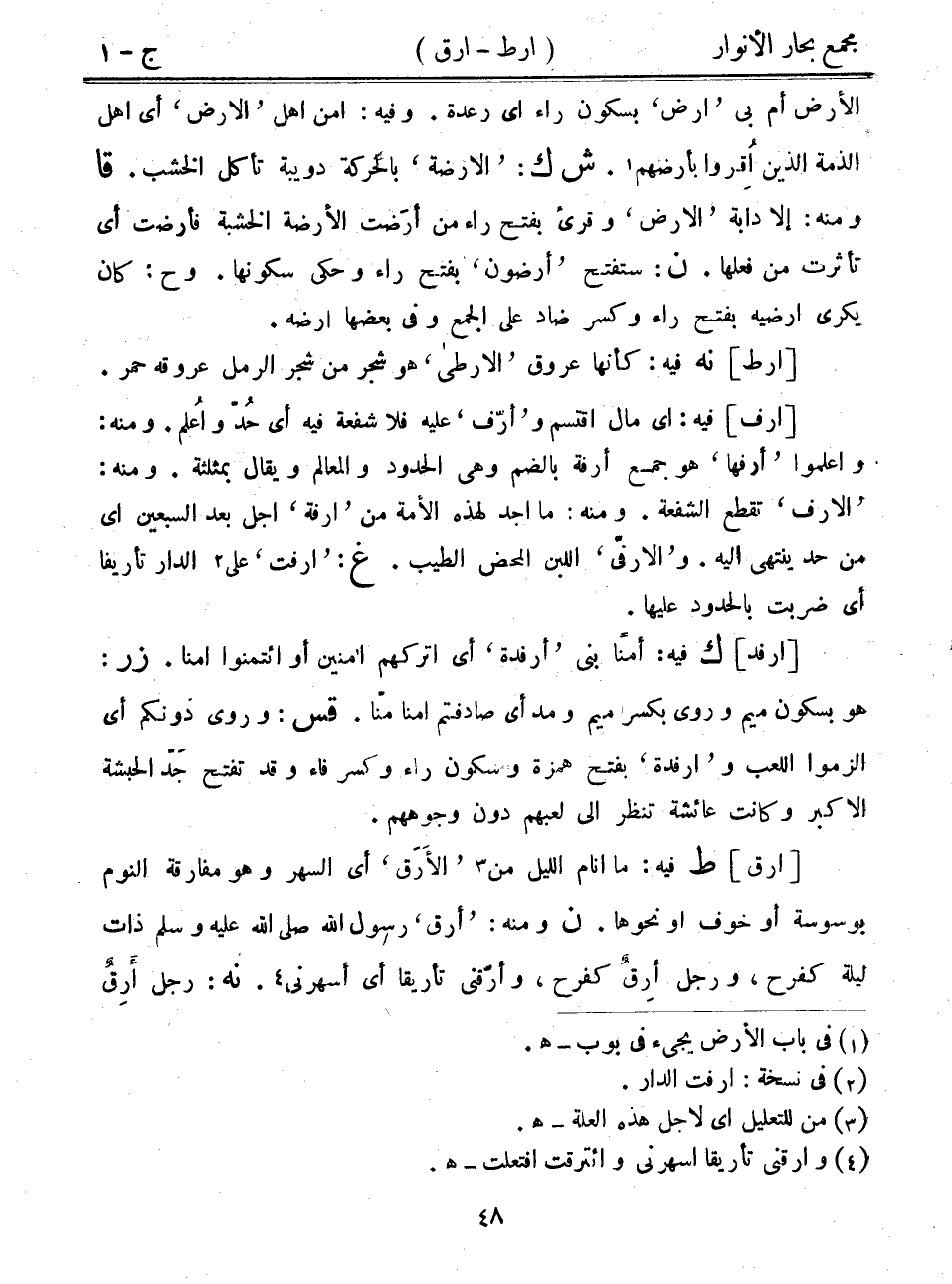 الأرض أم بي "أرض" بسكون راء أي رعدة. وفيه: أمن أهل "الأرض" أي أهل الذمة الذين أقروا بأرضهم. ش ك: "الأرضة" بالحركة دويبة تأكل الخشب. قا ومنه: إلا دابة "الأرض" وقرئ بفتح راء من أرضت الأرضة الخشبة فأرضت أي تأثرت من فعلها. ن: ستفتح "أرضون" بفتح راء وحكى سكونها. وح: كان يكرى أرضيه بفتح راء وكسر ضاد على الجمع وفي بعضها أرضه.