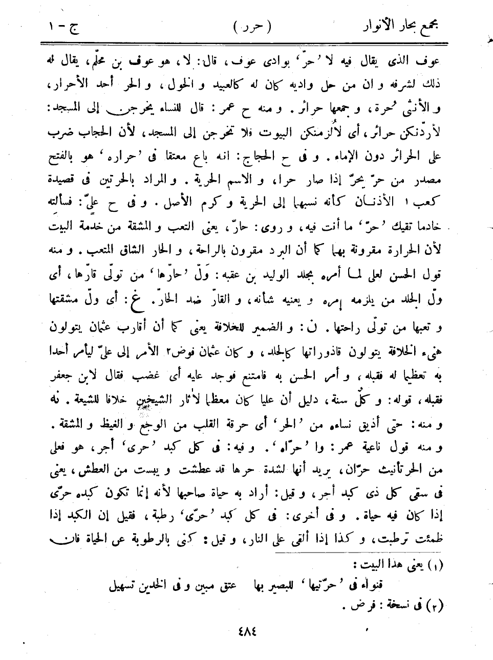 عوف الذي يقال فيه لا "حر" بوادي عوف، قال: لا، هو عوف بن محلم، يقال له ذلك لشرفه وأن من حل واديه كان له كالعبيد والخول، والحر أحد الأحرار، والأنثى "حرة" وجمعها حرائر. ومنه ح عمر: قال للنساء يخرجن إلى المسجد: لأردنكن حرائر، أي لألزمنكن البيوت فلا تخرجن إلى المسجد، لأن الحجاب ضرب على الحرائر دون الإماء. وفي ح الحجاج: أنه باع معتقاً في "حراره" هو بالفتح مصدر من حر يحر إذا صار حراً، والاسم الحرية. والمراد بالحرتين في قصيدة كعب الأذنان كأنه نسبهما إلى الحرية وكرم الأصل. وفي ح علي: فسألته خادماً تقيك "حر" ما أنت فيه، وروى: حار، يعني التعب والمشقة من خدمة البيت لأن الحرارة مقرونة بهما كما أن البرد مقرون بالراحة، والحار الشاق المتعب. ومنه قول الحسن لعلي لما أمره بجلد الوليد بن عقبه: ول "حارها" من تولى قارها، أي ول الجلد من يلزمه إمره ويعنيه شأنه، والقار ضد الحار. غ: أي ول مشقتها وتعبها من تولى راحتها. ن: والضمير للخلافة يعني كما أن أقارب عثمان يتولون هنئ الخلافة يتولون قاذوراتها كالجلد، وكانعثمان فوض الأمر إلى علي ليأمر أحداً به تعظيماً له فقبله، وأمر الحسن به فامتنع فوجد عليه أي غضب فقال لابن جعفر فقبله، قوله: وكل سنة، دليل أن علياً كان معظماً لآثار الشيخين خلافاً للشيعة. نه ومنه: حتى أذيق نساءه من "الحر" أي حرقة القلب من الوجع والغيظ والمشقة. ومنه قول ناعية عمر: وا "حراه". وفيه: في كل كبد "حرى" أجر، هو فعلى من الحر تأنيث حران، يريد أنها لشدة حرها قد عطشت ويبست من العطش، يعني في سقي كل ذي كبد أجر، وقيل: أراد به حياة صاحبها لأنه إنما تكون كبده حرى إذا كان فيه حياة. وفي أخرى: في كل كبد "حرى" رطبة، فقيل إن الكبد إذا ظمئت ترطبت، وكذا إذا ألقى على النار، وقيل: كني بالرطوبة عن الحياة فإن