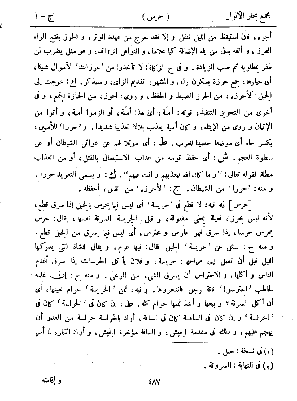 [حرس] نه فيه: لا قطع في "حريسة" أي ليس فيما يحرس بالجبل إذا سرق قطع، لأنه ليس بحرز، فعيلة بمعنى مفعولة، وقيل: الجريسة السرقة نفسها، يقال: حرس يحرس حرساً، إذا سرق فهو حارس ومحترس، أي ليس فيما يسرق من الجبل قطع. ومنه ح: سئل عن "حريسة" الجبل فقال: فيها غرم، ويقال للشاة التي يدركها الليل قبل أن تصل إلى مراحها: حريسة، وفلان يأكل الحرسات إذا سرق أغنام الناس وأكلها، والاحتراس أن يسرق الشيء من المرعى. ومنه ح: إن غلمة لحاطب "احترسوا" ناقة رجل فانتحروها. وفيه: ثمن "الحريسة" حرام لعينها، أي أن أكل السرقة وبيعها وأخذ ثمنها حرام كله. ط: إن كان في "الحراسة" كان في "الحراسة" وإن كان في الساقة كان في الساقة، أراد بالحراسة حراسة من العدو أن يهجم عليهم، وذلك في مقدمة الجيش، والساقة مؤخرة الجيش، واراد ائتماره لما أمر
