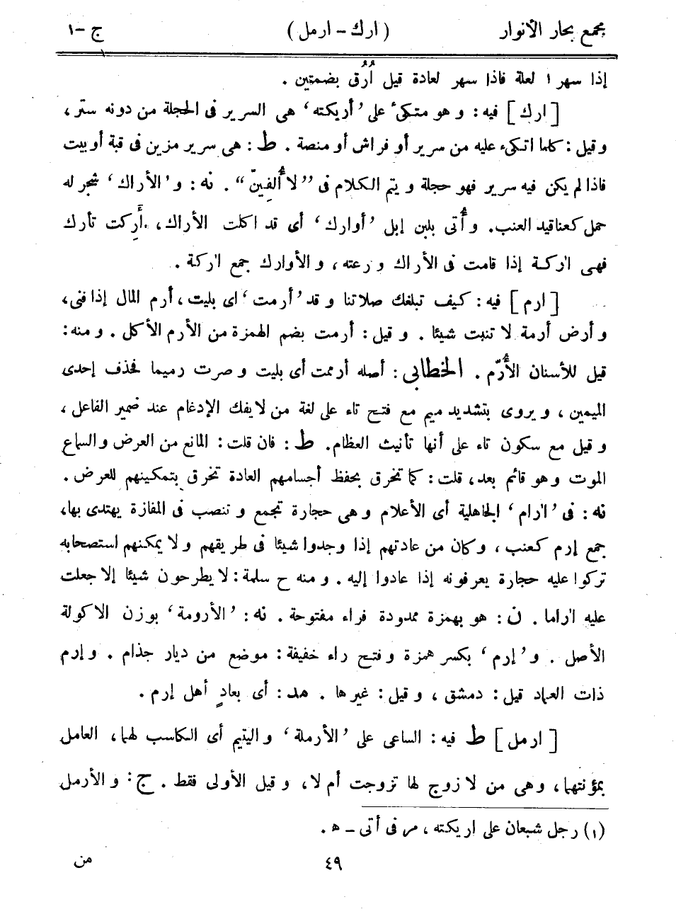 [أرم] فيه: كيف تبلغك صلاتنا وقد "أرمت" أي بليت، أرم المال إذا فنى، وأرض أرمة لا تنبت شيئاً. وقيل: أرمت بضم الهمزة من الأرم الأكل. ومنه: قيل للأسنان الأرم. الخطابي: أصله أرممت أي بليت وصرت رميماً فحذف إحدى الميمين، ويروى بتشديد ميم مع فتح تاء على لغة من لا يفك الإدغام عند ضمير الفاعل، وقيل مع سكون تاء على أنها تأنيث العظام. ط: فإن قلت: المانع من العرض والسماع الموت وهو قائم بعد، قلت: كما تخرق بحفظ أجسامهم العادة تخرق بتمكينهم للعرض. نه: في "أرام" الجاهلية أي الأعلام وهي حجارة تجمع وتنصب في المفازة يهتدى بها، جمع إرم كعنب، وكان من عادتهم إذا وجدوا شيئاً في طريقهم ولا يمكنهم استصحابه تركوا عليه حجارة يعرفونه إذا عادوا إليه. ومنه ح سلمة: لا يطرحون شيئاً إلا جعلت عليه أراما. ن: هو بهمزة ممدودة فراء مفتوحة. نه: "الأرومة" بوزن الأكولة الأصل. و"إرم" بكسر همزة وفتح راء خفيفة: موضع من ديار جذام. وإرم ذات العماد قيل: دمشق، وقيل: غيرها. مد: أي بعاد أهل إرم.