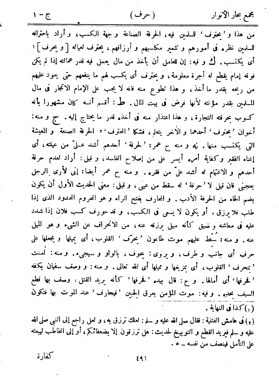من هذا و"يحترف" للمسلمين فيه، الحرفة الصناعة وجهة الكسب، وأراد باحترافه للمسلمين نظره في أمورهم وتثمير مكاسبهم وأرزاقهم، يحترف لعياله [ويحرف] أي يكتسب. ك وفيه: إن للعامل أن يأخذ من مال يعمل فيه قدر عمالته إذا لم يكن فوقه إمام يقطع له أجرة معلومة، ويحترف أي يكسب لهم ما ينفعهم حتى يعود عليهم من ربحه بقدر ما أخذ، وهذا تطوع منه فإنه لا يجب على الإمام الإتجار في مال المسلمين بقدر مؤنته لأنها فرض في بيت المال. ط: أقسم أنه كان مشهوراً بأنه كسوب بحرفته التجارة، وهذا اعتذار منه في أخذه قدر ما يحتاج إليه. ج ومنه: أخوان "يحترف" أحدهما والآخر يتعلم، فشكا "المحترف" الحرفة الصنعة والمعيشة التي يكتسب منها. نه ومنه ح عمر: "لحرفة" أحدهم أشد علي من عيلته، أي إغناء الفقير وكفاية أمره أيسر على من إصلاح الفاسد، وقيل: أراد لعدم حرفة أحدهم والاغتمام له أشد علي من فقره. ومنه ح عمر أيضاً: إني لأرى الرجل يعجبني فإن قيل لا "حرفة" له سقط من عيني، وقيل: معنى الحديث الأول أن يكون بضم الحاء من الحرفة الأدب. والمحارف بفتح الراء وهو المحروم المحدود الذي إذا طلب فلا يرزق، أو يكون لا يسعى في الكسب، وقد حورف كسب فلان إذا شدد عليه في معاشه وضيق كأنه ميل برزقه عنه، من الانحراف عن الشيء وهو الميل عنه. ومنه: سلط عليهم موت طاعون "يحرف" القلوب، أي يميلها ويجعلها على حرف أي جانب وطرف، ويروى: يحوف، بالواو وسيجيء. ومنه: أمنت "بمحرف" القلوب، أي بمزيغها ومميلها أي الله تعالى. ونمه: ووصف سفيان بكفه "فحرفها" أي أمالها. وح: قال بيده "فحرفها" كأنه يريد القتل، وصف بها قطع السيف بحده. وفيه: موت المؤمن بعرق الجبين "فيحارف" عند الموت بها فتكون