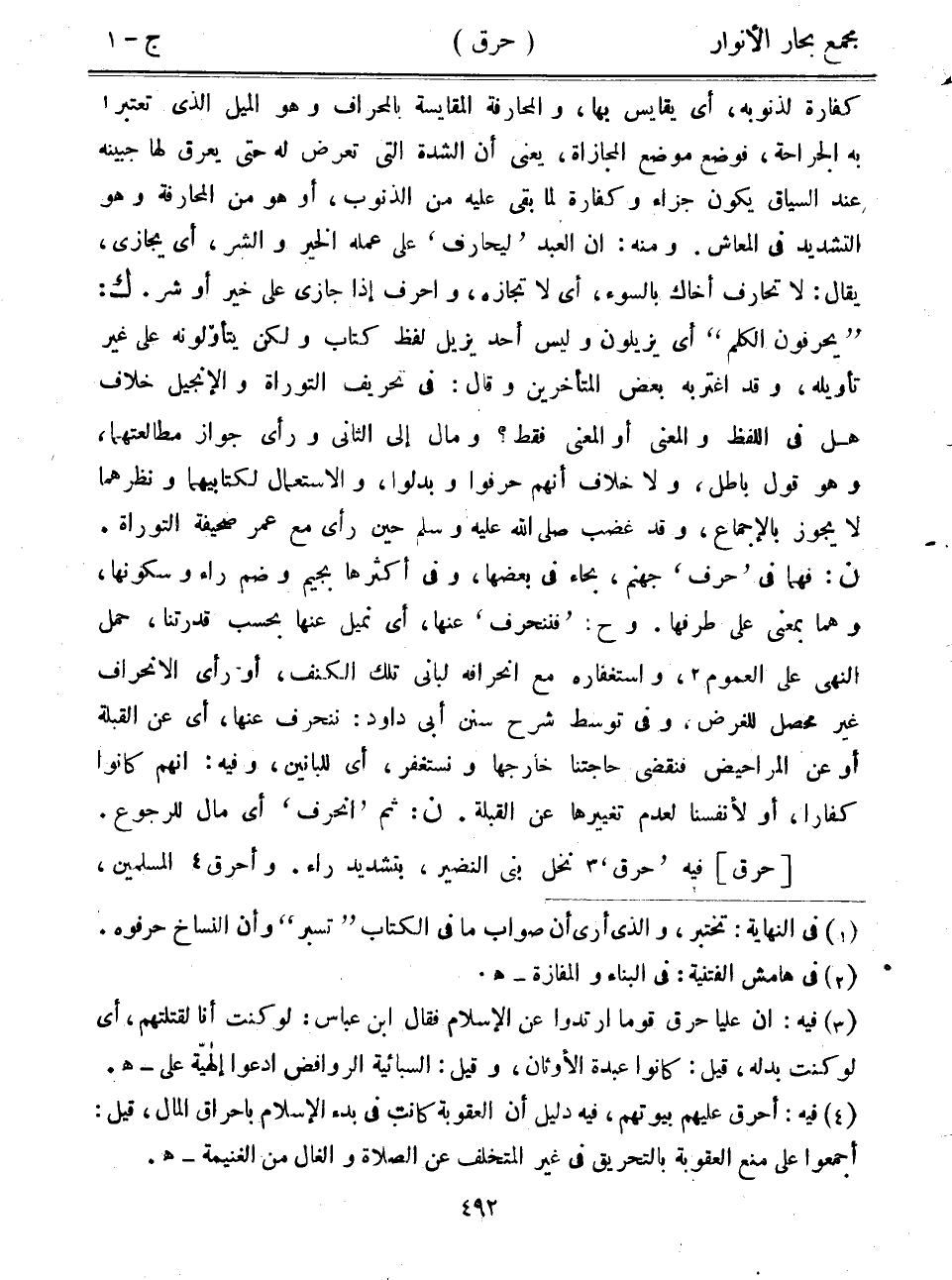 كفارة لذنوبه، أي يقايس بها، والمحارفة المقايسة بالمحراف وهو الميل الذي تعتبر به الجراحة، فوضع موضع المجازاة، يعني أن الشدة التي تعرض له حتى يعرق لها جبينه عند السياق يكون جزاء وكفارة لما بقي عليه من الذنوب، أو هو من المحارفة وهو التشديد في المعاش. ومنه: أن العبد "ليحارف" على عمله الخير والشر، أي يجازي، يقال: لا تحارف أخاك بالسوء، أي لا تجازه، واحرف إذا جازى على خير أو شر. ك: "يحرفون الكلم" أي يزيلون وليس أحد يزيل لفظ كتاب ولكن يتأولونه على غير تأويله، وقد اغتربه بعض المتأخرين وقال: في تحريف التوراة والإنجيل خلاف هل في اللفظ والمعنى أو المعنى فقط؟ ومال إلى الثاني ورأى جواز مطالعتهما، وهو قول باطل، ولا خلاف أنهم حرفوا وبدلوا، والاستعمال لكتابيهما ونظرهما لا يجوز بالإجماع، وقد غضب صلى الله عليه وسلم حين رأى مع عمر صحيفة التوراة. ن: فهما في "حرف" جهنم، بحاء في بعضها، وفي أكثرها بجيم وضم راء وسكونها، وهما بمعنى على طرفها. وح: "فننحرف" عنها، أي نميل عنها بحسب قدرتنا، حمل النهي على العموم، واستغفاره مع انحرافه لباني تلك الكنف، أو رأى الانحراف غير محصل للغرض، وفي توسط شرح سنن أبي داود: ننحرف عنها، أي عن القبلة أو عن المراحيض فنقضي حاجتنا خارجها ونستغفر، أي للبانين، وفيه: أنهم كانوا كفاراً، أو لأنفسنا لعدم تغييرها عن القبلة. ن: ثم "انحرف" أي مال للرجوع.
