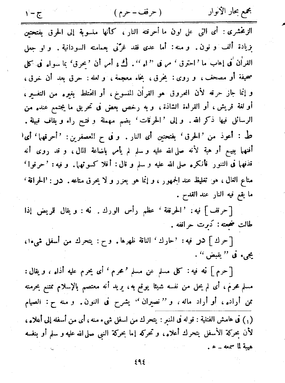 الزمخشري: أي التي على لون ما أحرقته النار، كأنها منسوبة إلى الحرق بفتحتين بزيادة ألف ونون. ومنه: أما عدي فقد غرني بعمامته السودانية. ولو جعل القرآن في إهاب ما "احترق" مر في "اه". ك: أمر أن "يحرق" بما سواه في كل صحيفة أو مصحف، وروى: يخرق، بخاء معجمة، ولعله: حرق بعد أن خرق، وإنما جاء حرقه لأن المحروق هو القرآن المنسوخ، أو المختلط بغيره من التفسير، أو لغة قريش، أو القراءة الشاذة، وبه رخص بعض في تحريق ما يجتمع عنده من الرسائل فيها ذكر الله. وإلى "الحرقات" بضم مهملة وفتح راء وبقاف قبيلة. ط: أعوذ من "الحرق" بفتحتين أي النار. وفي ح المعصفرين: "أحرقهما" أي أفنهما ببيع أو هبة لأنه صلى الله عليه وسلم لم يأمر بإضاعة المال، وقد روى أنه قذفهما في التنور فأنكره صلى الله عليه وسلم وقال: أفلا كسوتهما. وفيه: "حرقوا" متاع الغال، هو تغليظ عند الجمهور، وإنما هو يعزر ولا يحرق متاعه. در: "الحراقة" ما يقع فيه النار عند القدح.